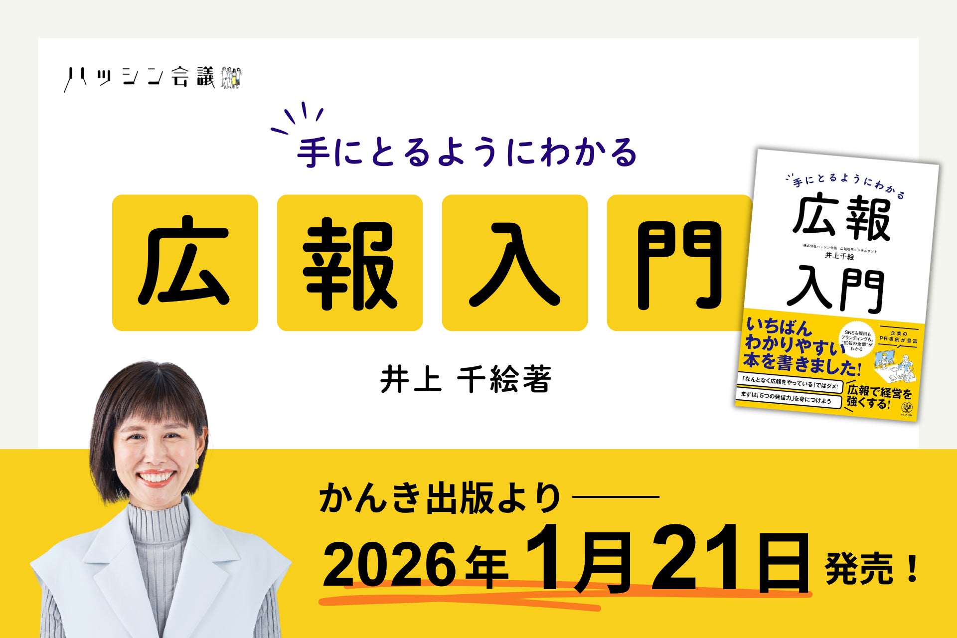 広報人材育成を専門とする株式会社ハッシン会議(本社:東京・南青山)の代表取締役・井上千絵は、著書『手にとるようにわかる広報入門』を、かんき出版より2026年1月21日に発売します。広報をこれからはじめる人・組織が押さえておくべき広報の基礎知識に、最新の広報トレンドと現場の視点・豊富な事例を加えています。