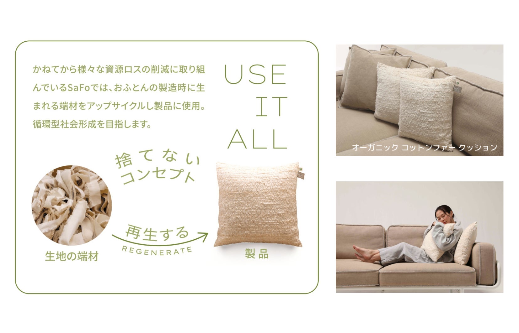 布団の製造時に生まれる端材を大胆にアップサイクル、まるで毛皮のような感触だけど、実はオーガニックコットン100%のクッション