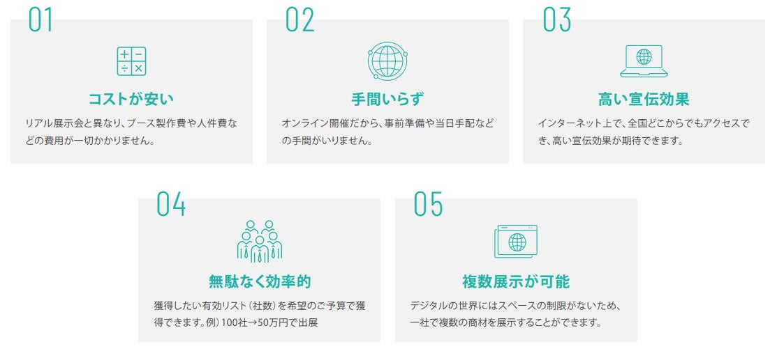 販路開拓が必要な企業様に嬉しい、オンラインならではの5つの特長。