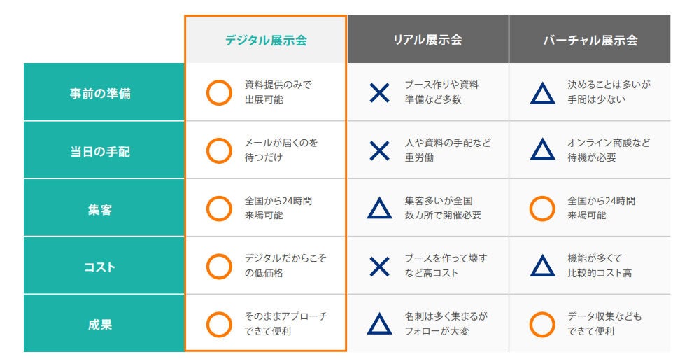 デジタル展示会と、従来のリアルの展示会、そして最近流行っているその場で名刺交換や商談ができるバーチャル展示会との違いを表にしました。マッチング(リスト獲得)というゴールに無駄なくアプローチできるのがデジタル展示会の特長です。