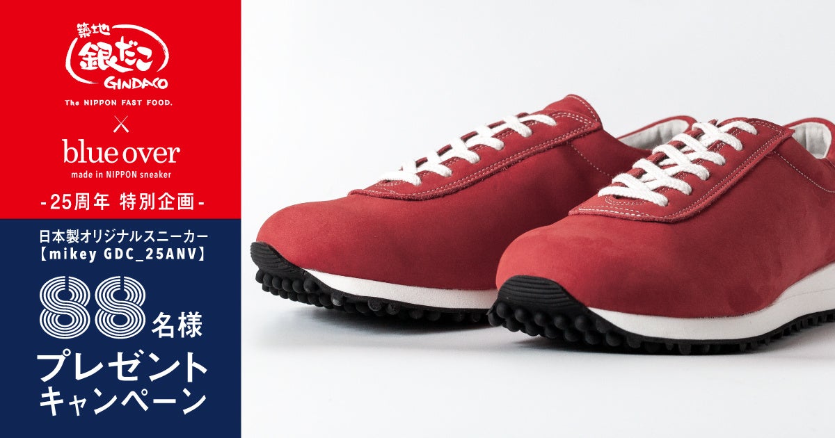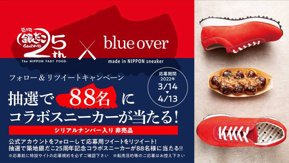 純国産スニーカーブランド 「blueover(ブルーオーバー)」(以下、「blueover」) などを展開する株式会社 BATON(本社:大阪府大阪市、代表取締役社長:渡利ヒトシ)と、築地銀だこを展開する株式会社ホットランド(本社:東京都中央区、代表取締役社長:佐瀬守男)は、「築地銀だこ」25周年を記念した特別コラボレーションを実施。