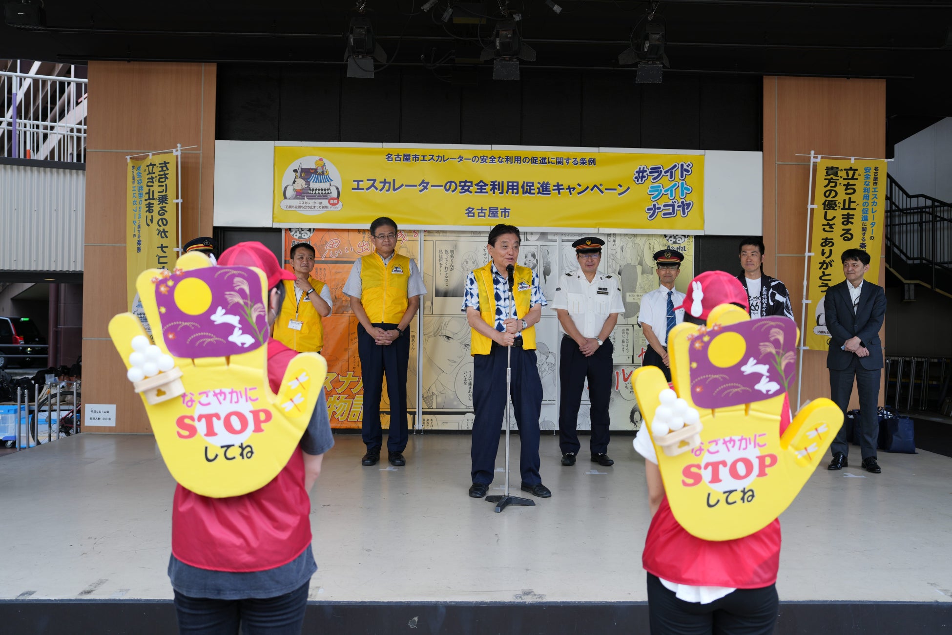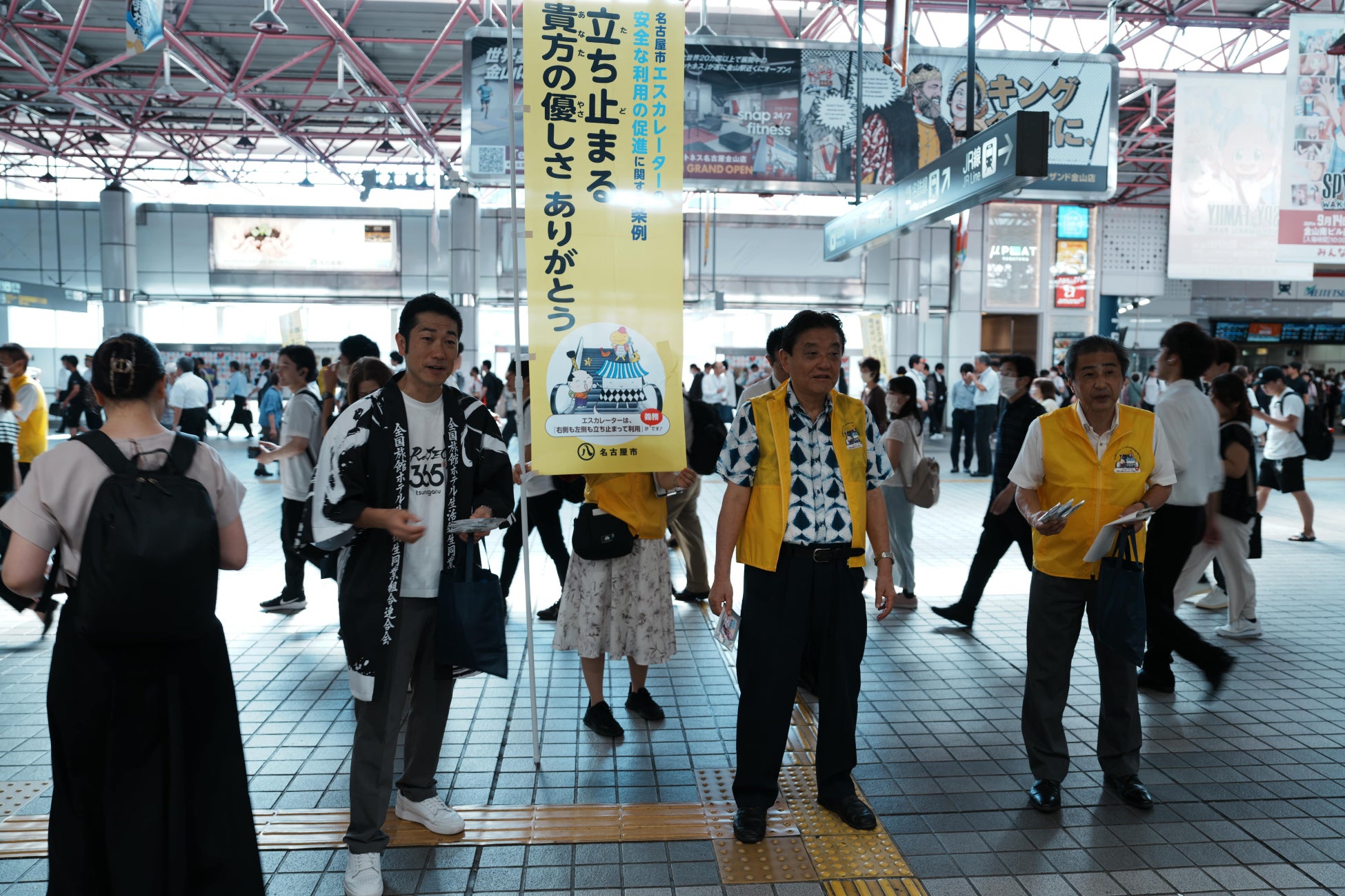 金山駅で開催されたキャンペーンには、河村たかし名古屋市長も参加され、駅利用者へエスカレーターには立ち止まって乗ることを直接の呼びかけを通じて促した。