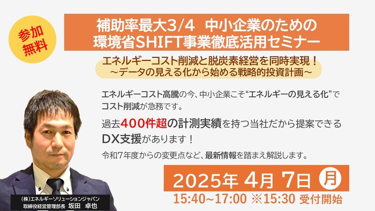 株式会社エネルギーソリューションジャパン(本社:東京都中央区、代表取締役:田﨑 剛史、以下「ESJ」)は、2025年4月7日(月)に「環境省SHIFT補助金活用セミナー」をオンラインで開催いたします。本セミナーでは、令和6年度補正予算3,000百万円、令和7年度予算案2,786百万円で実施される環境省のSHIFT事業(脱炭素技術等による工場・事業場の省CO2化加速事業)について、最新の公募情報を踏まえた実践的な活用方法を解説します。