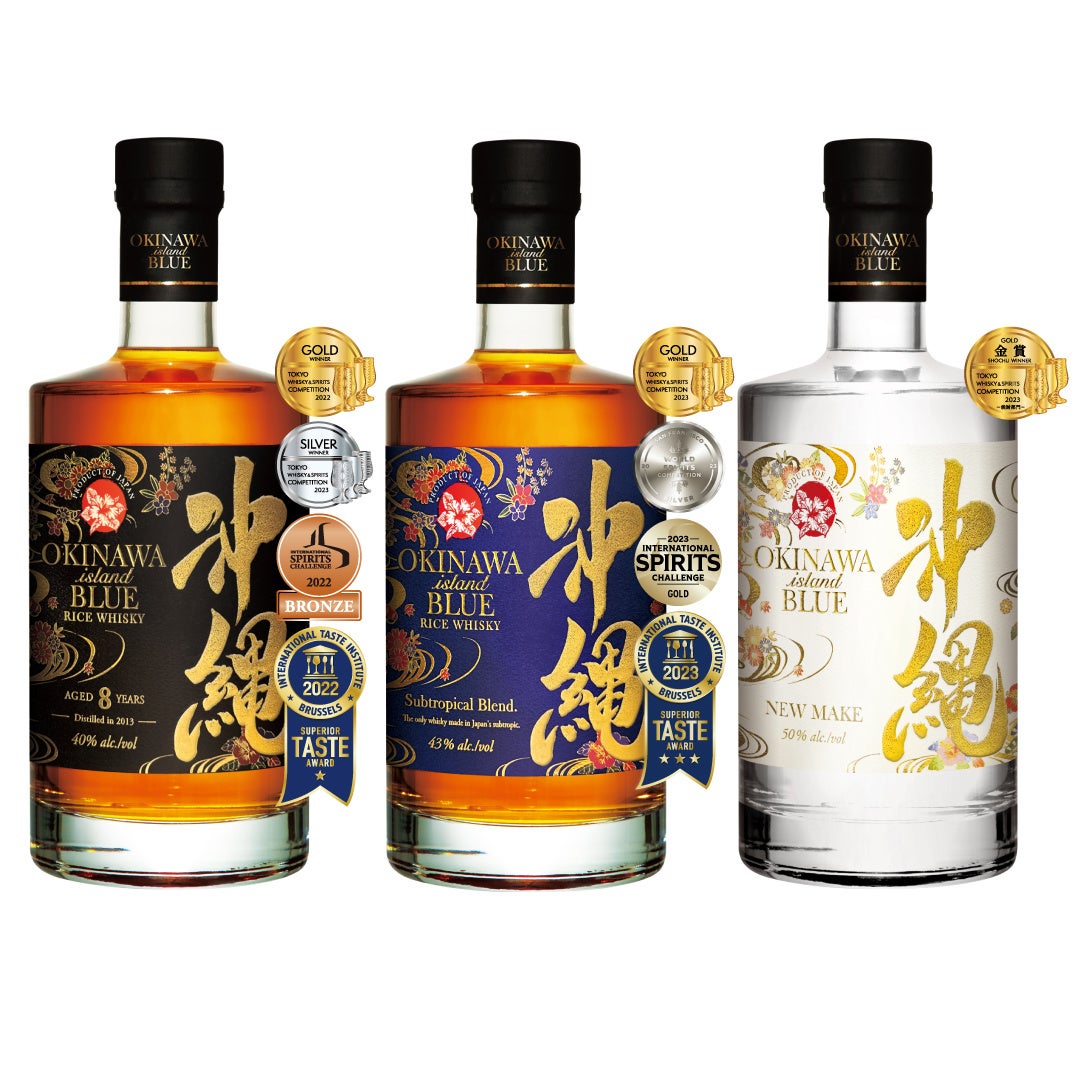 ストレートやロックで楽しめる沖縄 ISLAND BLUE 8年、ハイボールが香り高い43度、さらに樽に貯蔵する前のお酒NEW MAKEを加えた3本で、沖縄ライスウイスキーの飲みくらべが楽しめます。3本の特徴と品評会受賞歴は以下のとおりです。