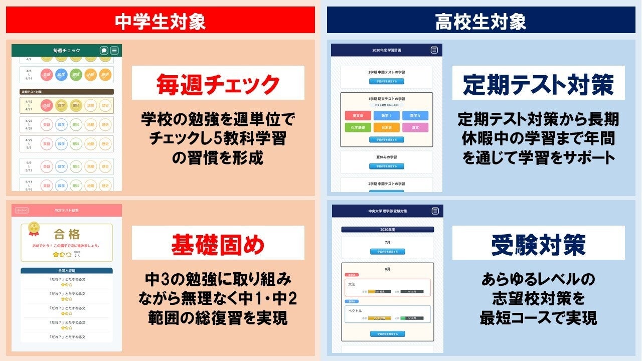 診断結果をもとに理解度に応じた学習法を提示。基本的な内容から見直す必要のある単元は、映像授業で丁寧に学習。ある程度理解できている単元は、「要点まとめ」でポイントを確認した後、練習問題にチャレンジできます。正確な診断結果をもとにレベルに合わせた学習法を提示してくれるため、無理なく無駄のない学習で最短での成績向上が望めます。