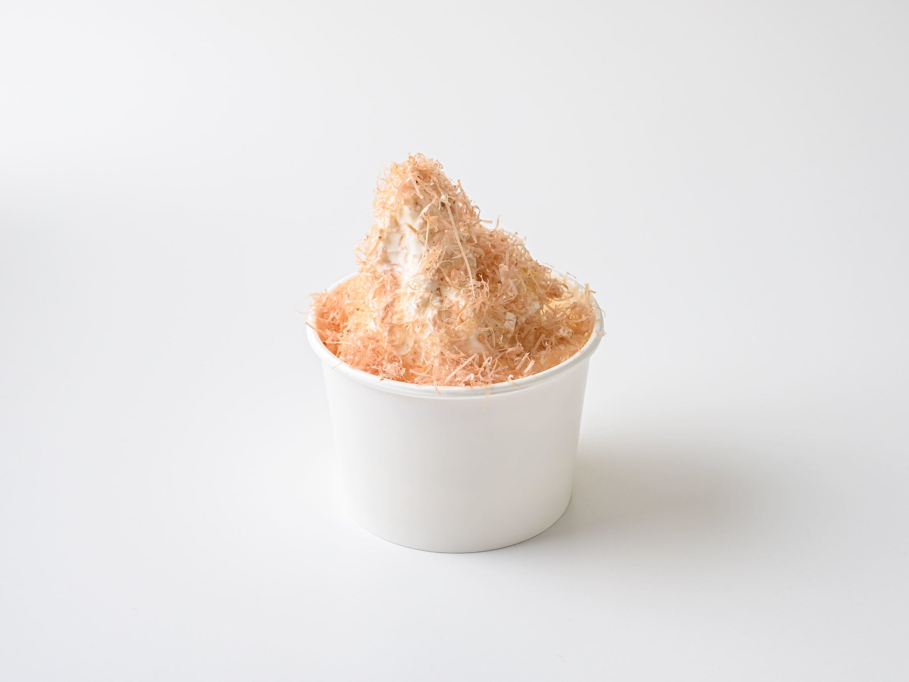 北海道根釧牛乳で仕立てたソフトクリームに、300年余続く鰹節専門店にんべんのふわふわとした糸削り鰹節と、アクセントとしてかつお塩をひとつまみ、さらに「みつあめ 有平糖」をトッピングしました。意外な組み合わせですが、ミルク感が引き立ち、後を引く味わいです。