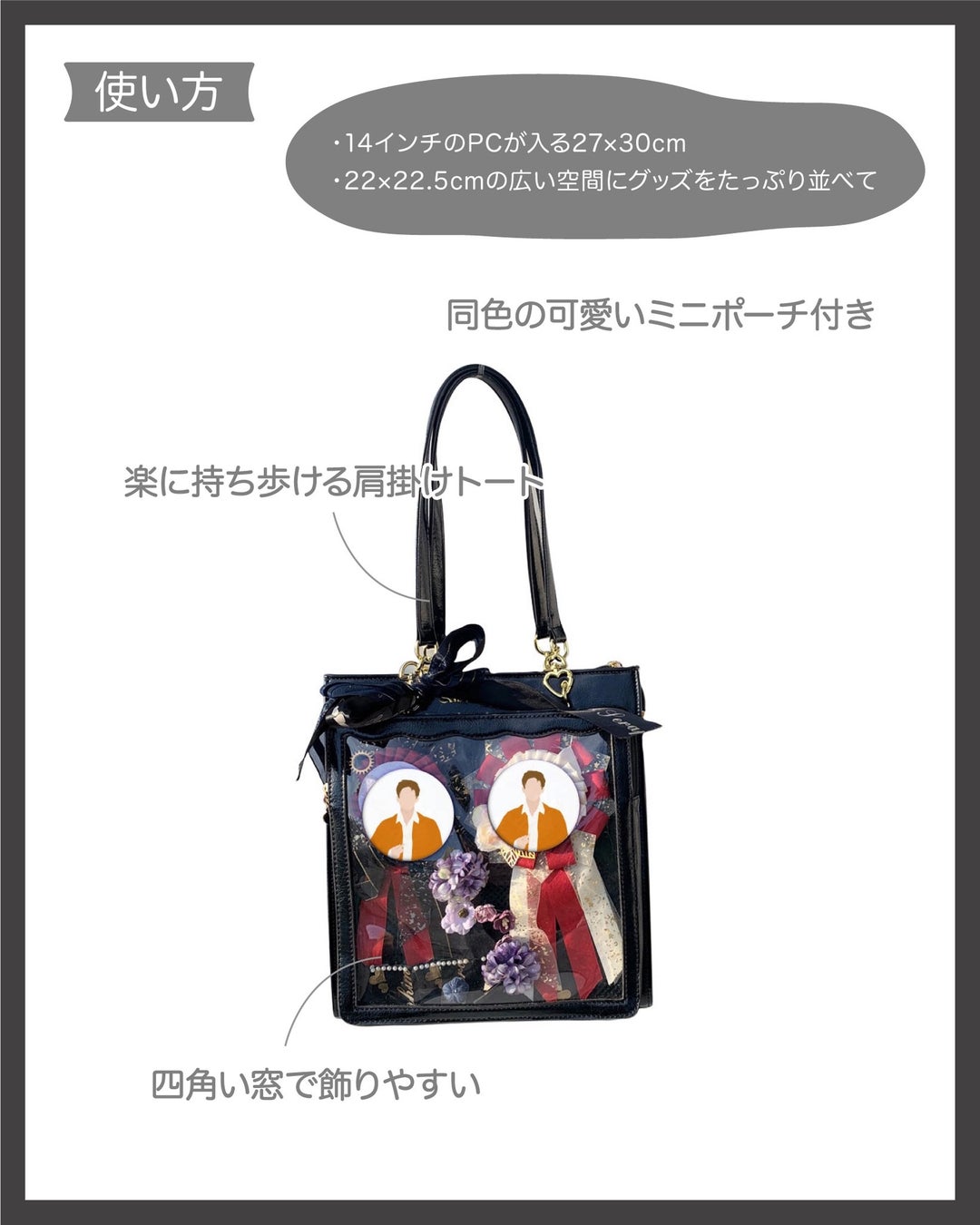 トートバッグ型の推し活バッグです。シンプルで高級感のあるデザインかつ、14インチまでのPCも収納できるサイズでお仕事帰りに現場に直行も叶います。バッグ自体も付属のミニポーチも、しっかりグッズを飾れるクリア窓付きです。
