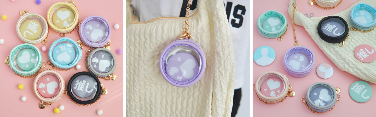 缶バッジ収納にちょうどいいクリアミニポーチです。丸いシルエットが缶バッジにフィットします。チャームのようにバッグに下げることができ、アクセサリーやイヤホンなどの小物収納として普段使いにも便利です。