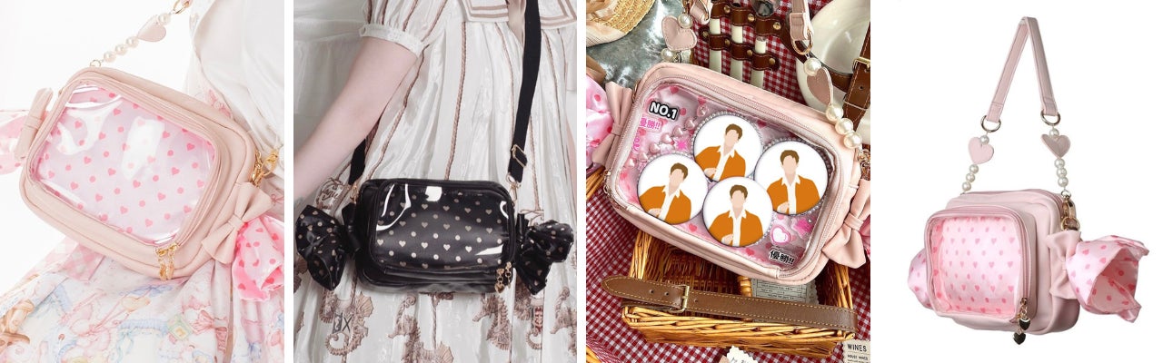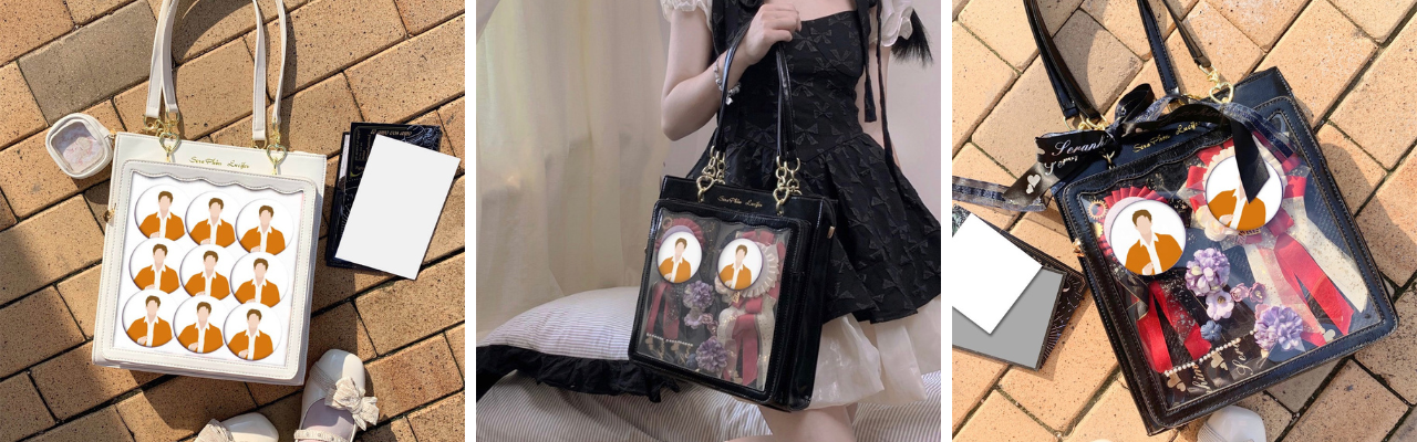 キャンディのようなシルエットが可愛い、クリア窓付きの推し活用バッグです。リボンやハートを散りばめたフェミニンなデザインがたまりません。ストラップを付け替えたり外してポーチにしたり、グッズを飾らずに普段使いのバッグとしても幅広くお使いいただけます。