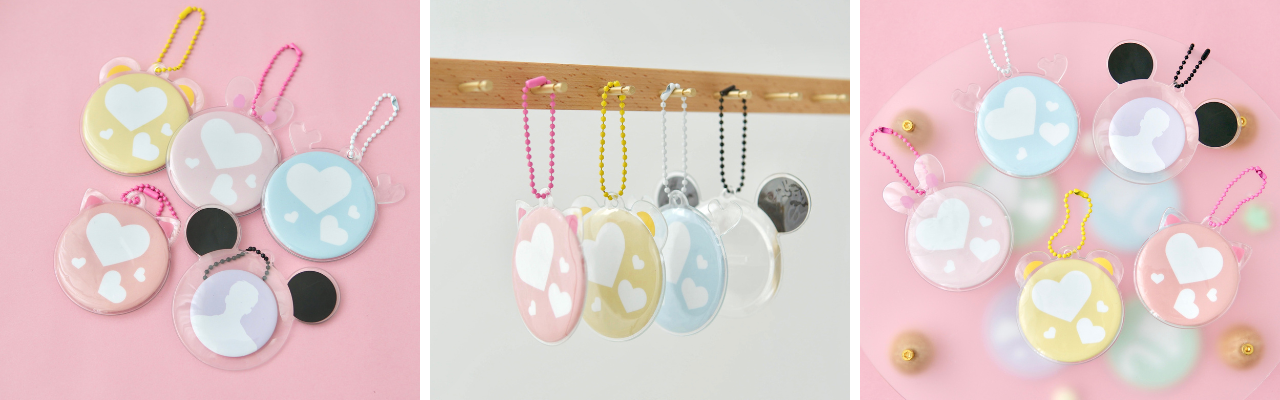 しっかりバッジを守りながら可愛いシルエットにアレンジできる缶バッジ保護ケースです。そのままバッグに下げられるチェーンも付いています。キズや汚れから守るのはもちろん、防水素材で雨の日も安心です。