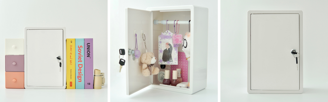 ディスプレイから収納まで使える鍵付きのミニ収納ボックスです。別途でフックやつっぱり棒を取り付ければさらに収納力が上がります。シンプルな見た目で日常生活やオフィスシーンでの使用も違和感がなく、ステッカーなどでのデコレーションも自由自在です。
