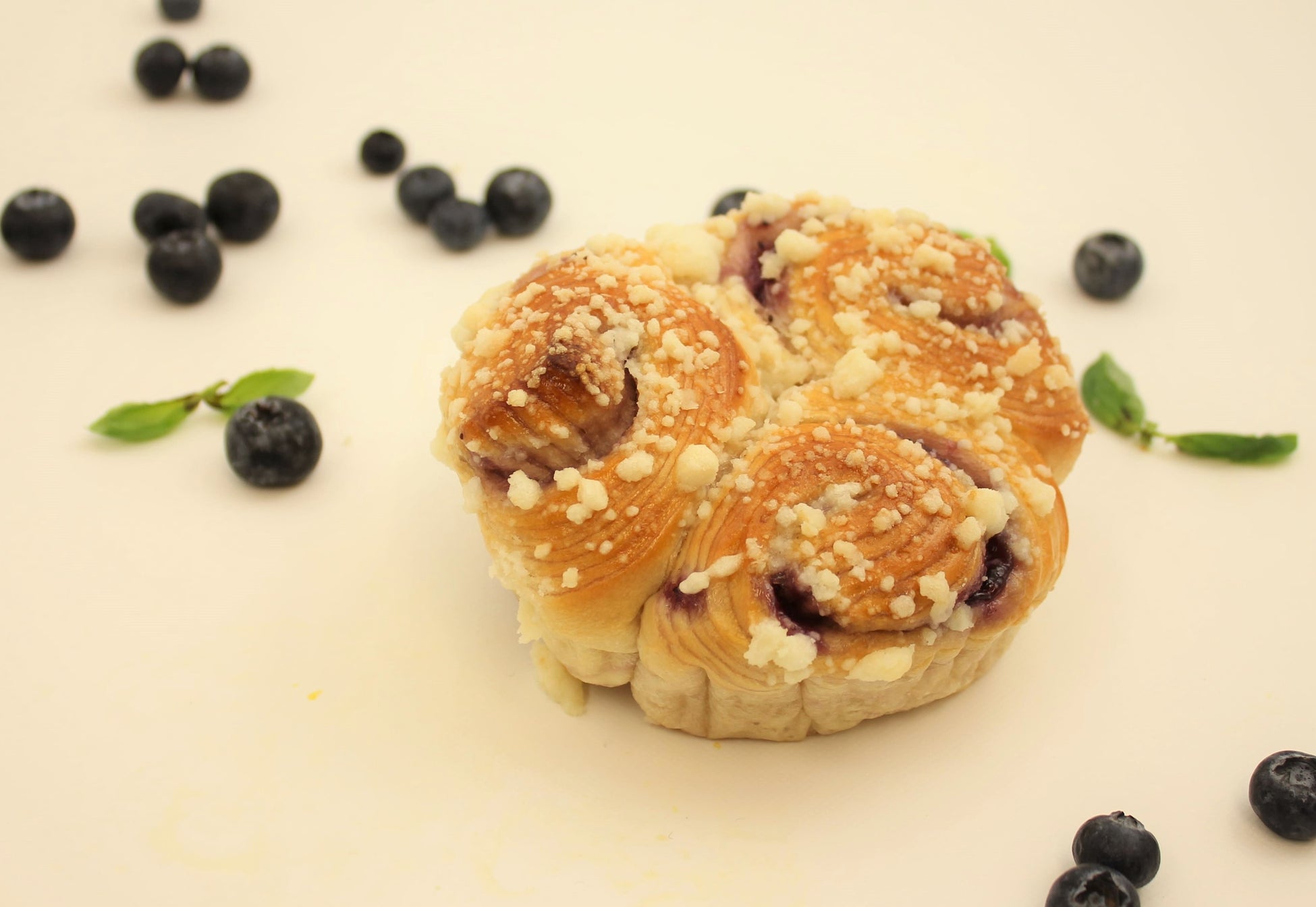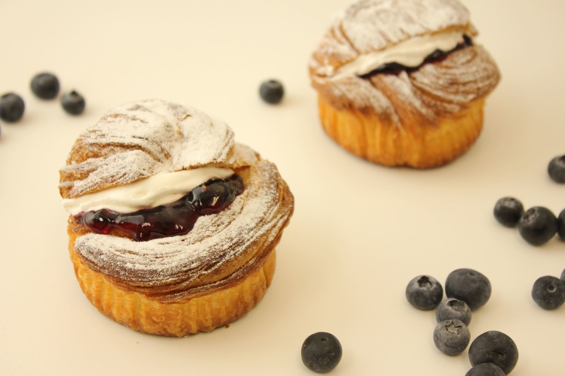ブルーベリー果汁の入ったクリームを折り込んだ生地にさらにブルーベリージャムを巻き込み、フルーティーな味わいと香りを楽しめる一品に。