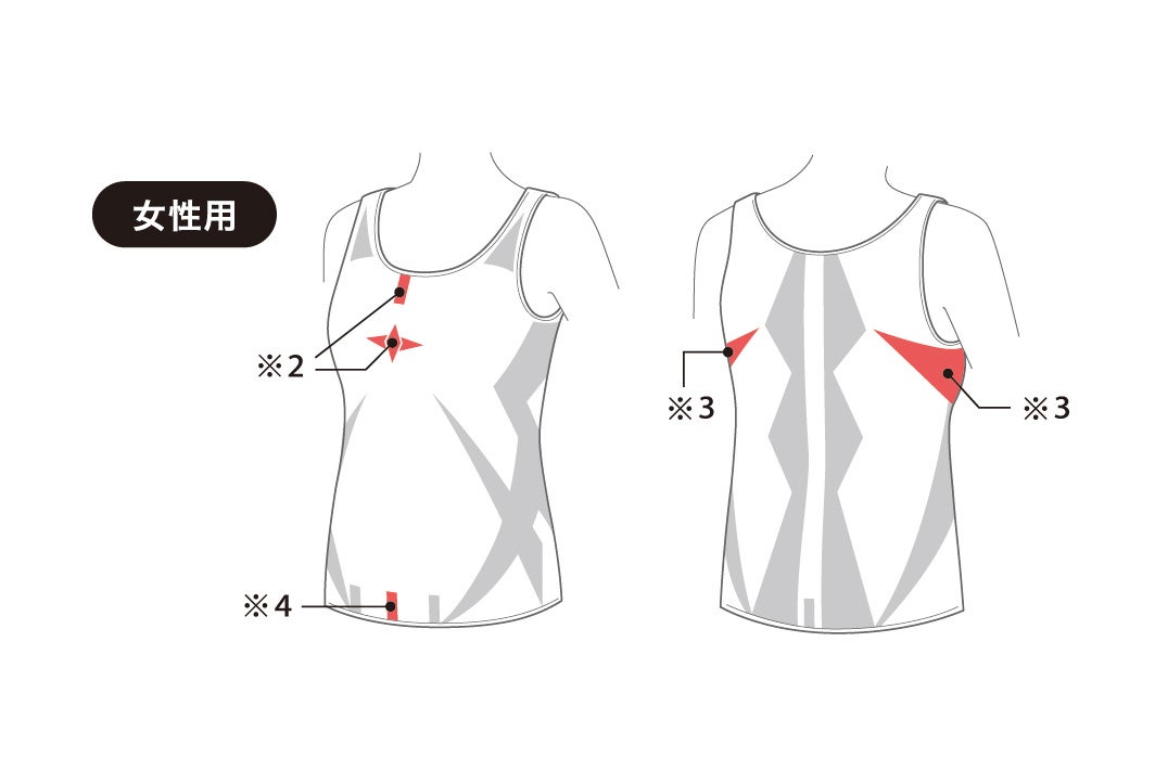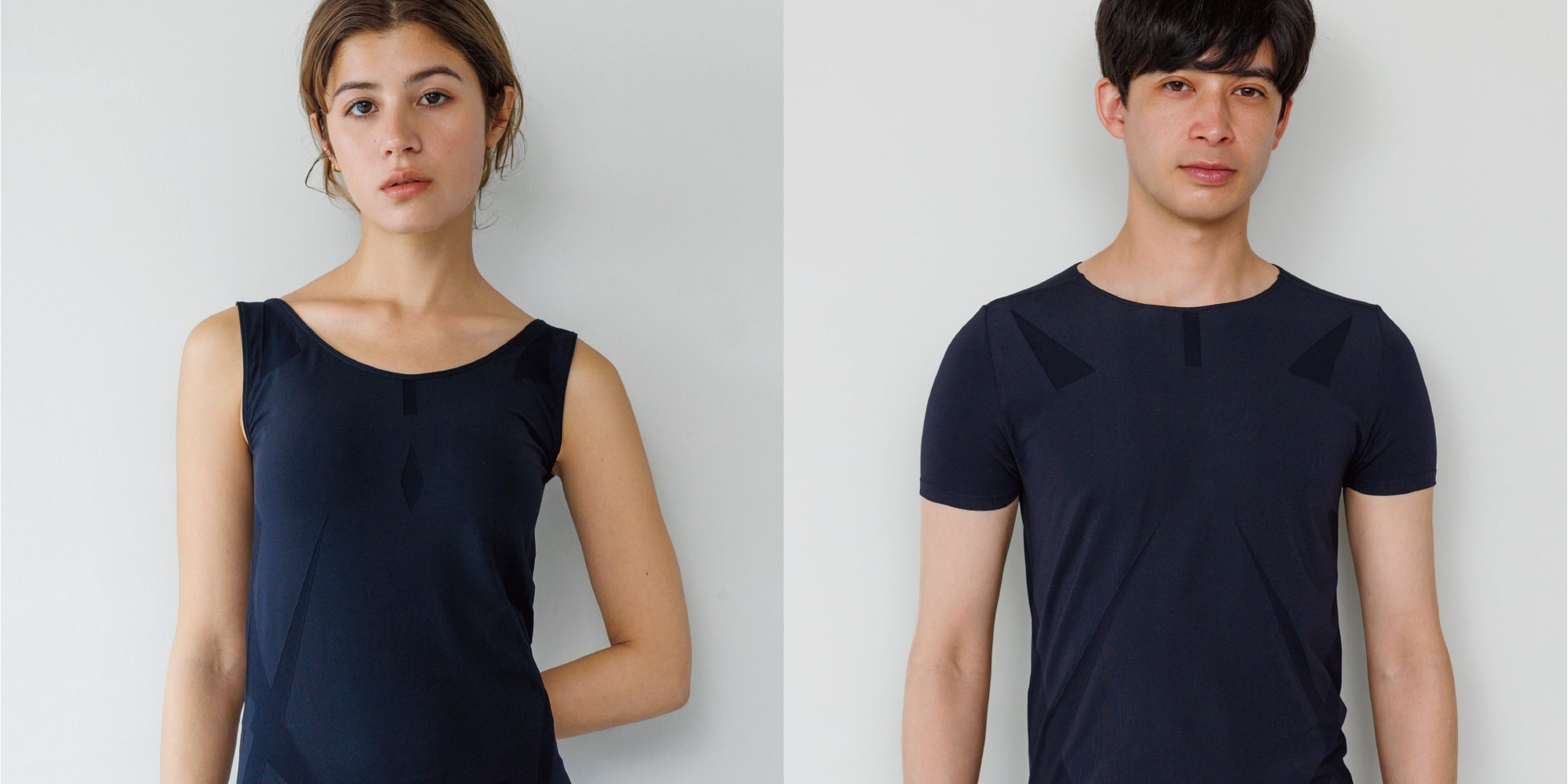 デザインのように配されている生地の凹凸が皮膚の感覚センサーにサインを送ることで、直接皮膚に触れていなくても筋肉へアプローチし、本来の姿勢へ導きます。とくに、男性用は肩が引き上がらないよう僧帽筋(※1)をサポート。女性用は、胸の中心部の胸骨(※2) と、サイドの広背筋(※3)部分を強化しています。