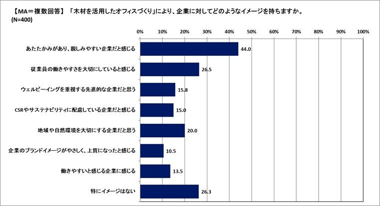 木材活用の企業に対して持つ具体的なイメージでは、「あたたかみがあり、親しみやすい企業だと感じる」(44.0%)、「従業員の働きやすさを大切にしていると感じる」(26.5%)、「地域や自然環境を大切にする企業だと思う」(20.0%)、「働きやすいと感じる企業に感じる」(13.5%)など、“従業員配慮”“地域・自然への配慮”“企業姿勢の上質さ”といった価値観を想起させる項目が多数を占めた。