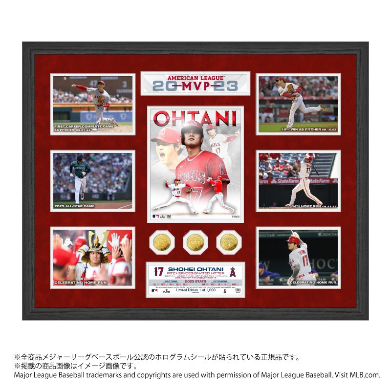 大谷翔平選手のMLB 2023シーズンにおける印象的な活躍シーンを特大フレームに複数カット収めたメモリアルグッズです。AL MVPとHR王、オールスター出場のカットなど、プレミアムにふさわしい贅沢な仕様になっています。