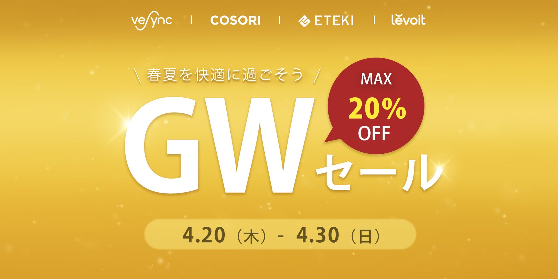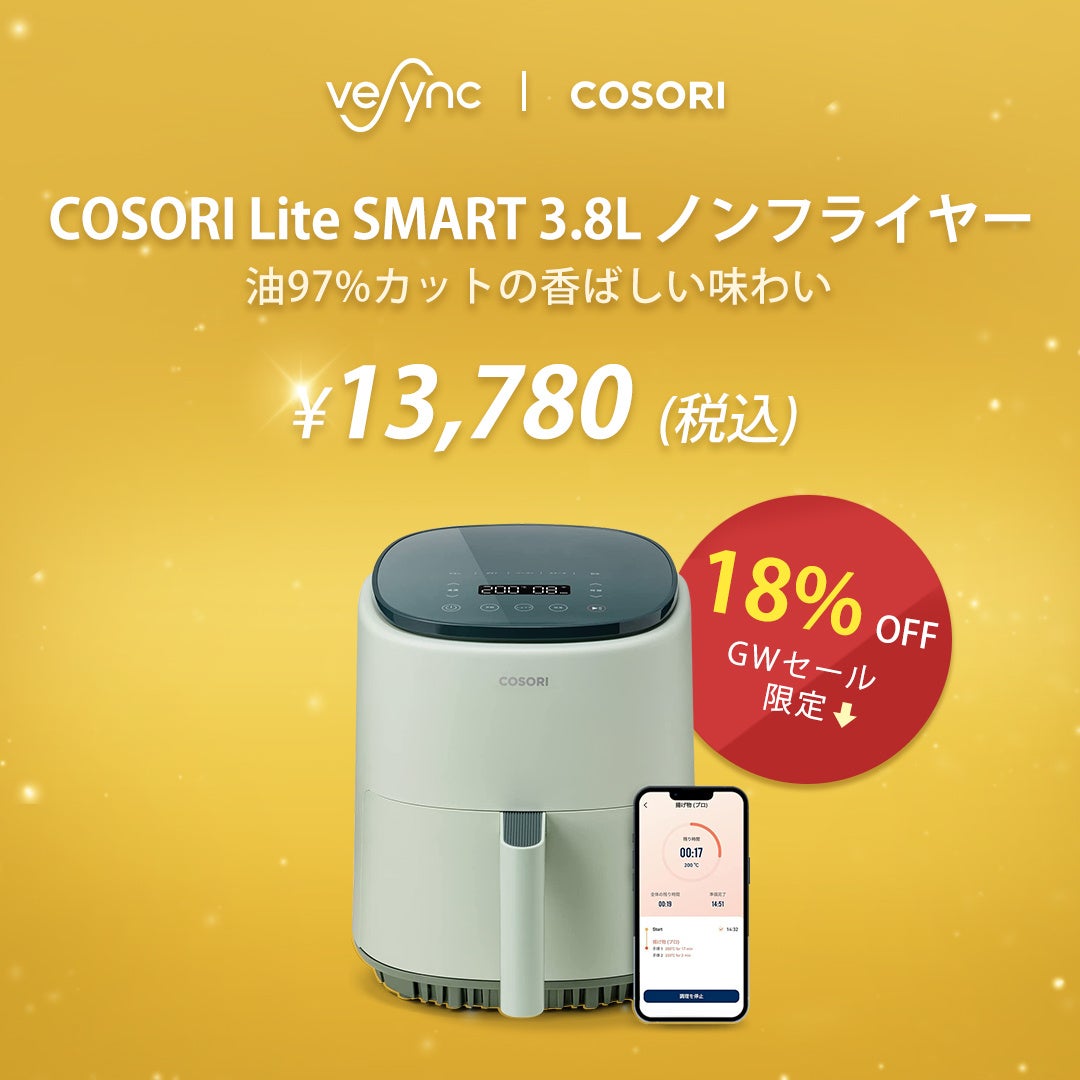 アメリカ発の小型家電メーカーのVeSync(ウィーシンク) Co., Ltd(本社:アメリカ、カリフォルニア州)は、 2023年4月20日(木)から、GWセールをVeSync公式ストアとAmazon公式店舗にて開催いたします。 Levoit空気清浄機、COSORIノンフライヤー等のVeSync家電製品で、より心地よい暮らしを提供したいと思い ます。 間もなく始まるゴールデンウィークの連休、是非快適なご自宅生活をお過ごしください。