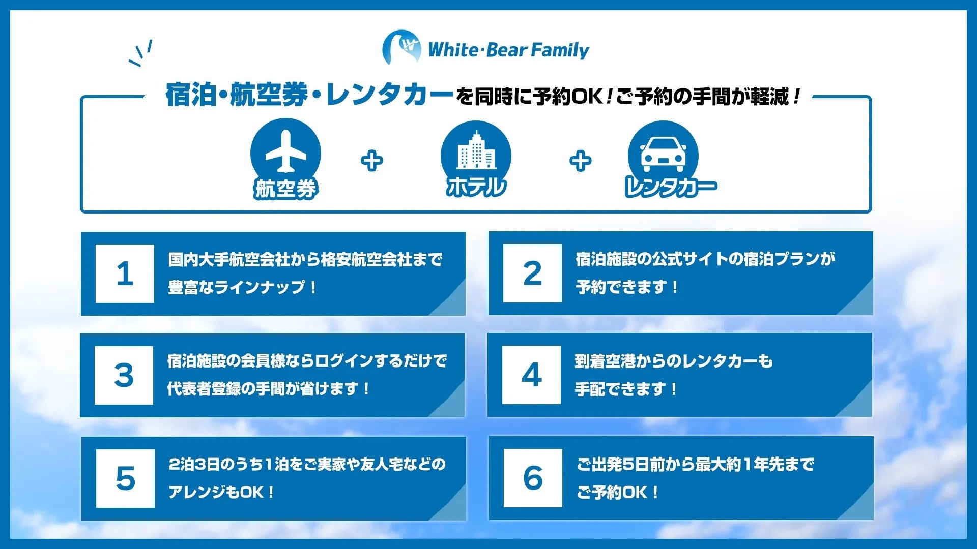 「ホワイト・ベアーファミリー」が提供する国内旅行予約システムと、LINEヤフーグループの「ダイナテック」が国内宿泊施設の約6,400施設に提供する宿泊予約システム「Direct In」の最新モデル「D-irect In S4(ダイレクトインエスフォー)」との連携により、パッケージツアー向け航空運賃を利用した往復航空券と、宿泊施設の公式サイトで販売している宿泊プランをセットで販売することが可能になりました。さらに、現地のレンタカーも合わせて予約手配ができるなど、旅行者にとって旅行予約の利便性の向上にも繋がります。ご予約の際は、宿泊施設公式サイトのベストレートプランや公式サイト限定プランが選択でき、フライト選択画面では国内大手航空会社やLCCを含めた10社の航空会社のフライトを一度に比較できることから、旅行者のニーズに合わせた柔軟な予約が可能になります。