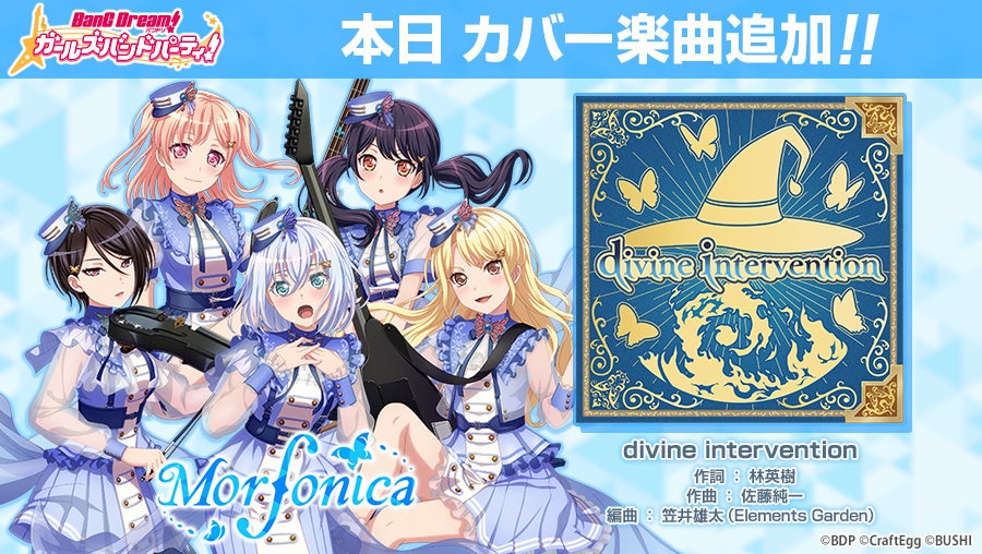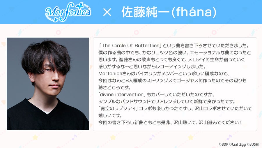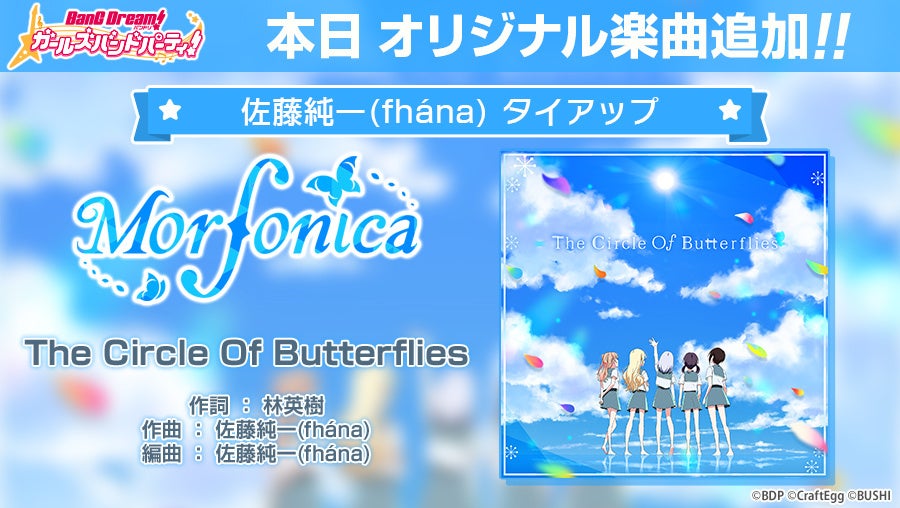 株式会社Craft Egg(本社:東京都渋谷区 代表取締役:森川 修一、以下、Craft Egg)と、株式会社ブシロード(本社:東京都中野区 代表取締役社長:木谷 高明、以下、ブシロード)の共同制作によるスマートフォン向けゲーム「バンドリ! ガールズバンドパーティ!」(以下、ガルパ)は、2022年9月23日(金・祝)22時より、アーティストタイアップ第6弾として「Morfonica×佐藤純一(fhána)」を実施し、佐藤純一(fhána)さんからMorfonicaへの提供楽曲『The Circle Of Butterflies』をゲーム内に追加いたしました。