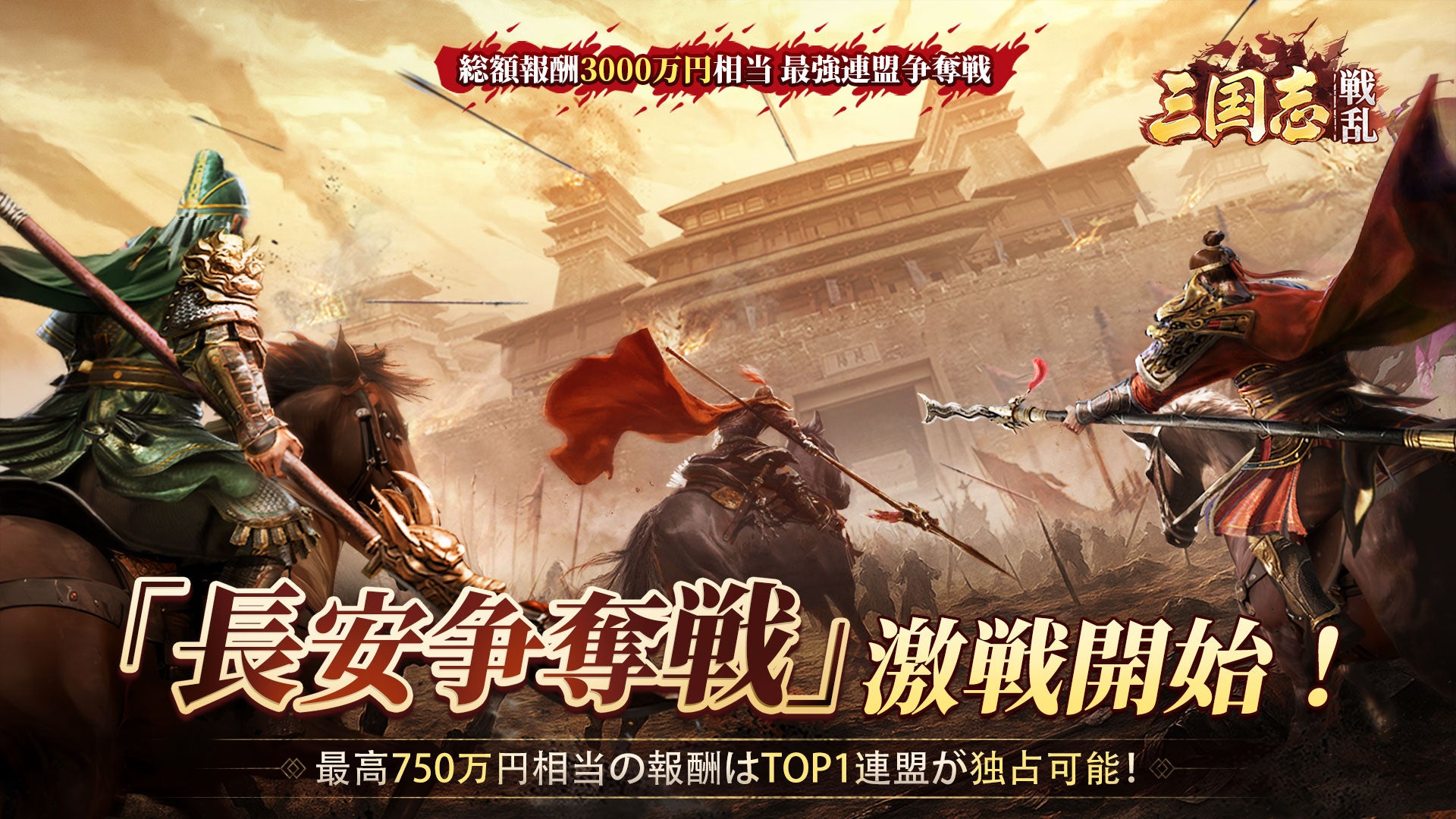 長安争奪戦では、ゲーム内で【連盟が長安を占領するまでの所要時間】に応じて順位が決定され、上位5連盟には総額1,300万円相当の報酬が贈られます。詳細は公式X(@sangokusenran)や特設サイトにてご確認ください。