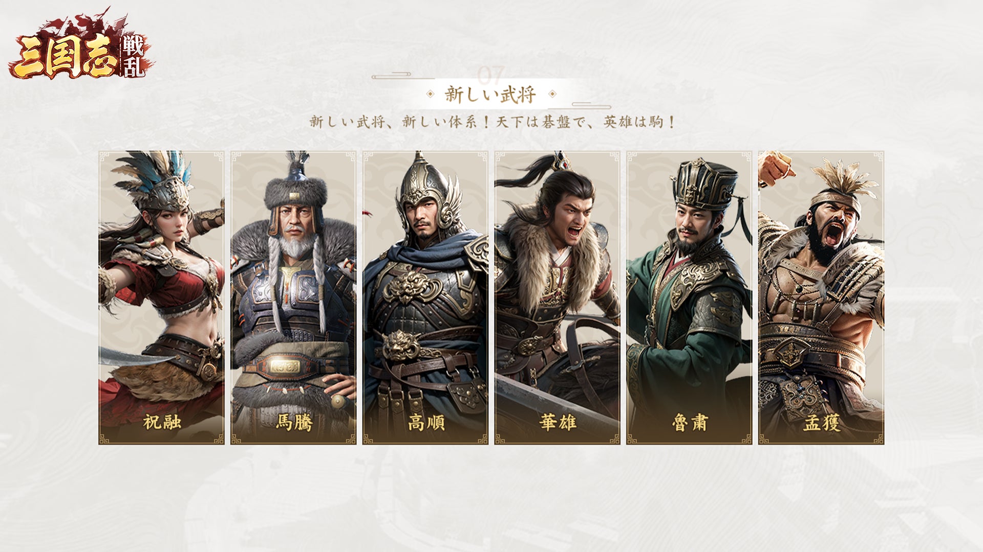祝融、華雄、孟獲など、新たな武将たちが間もなく登場します。新たな編成システムをぜひ体験してください。