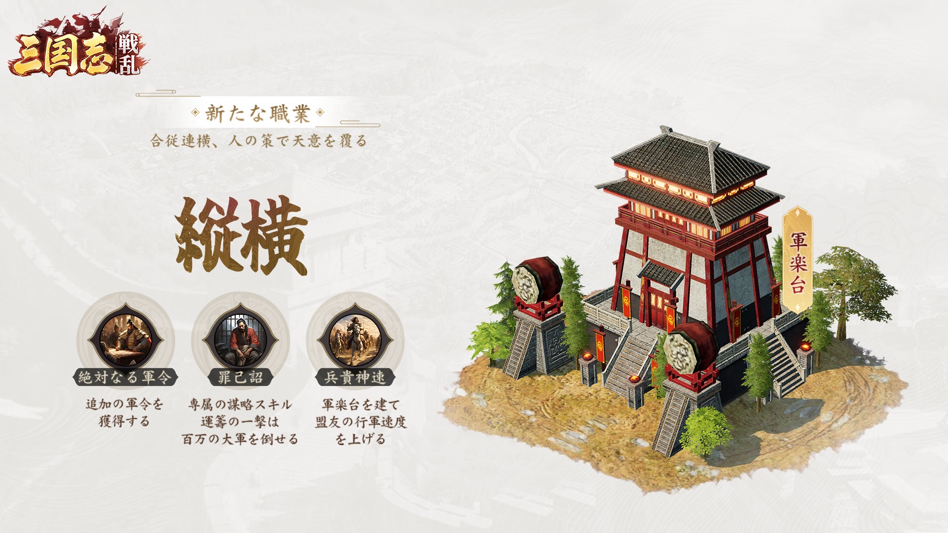 「縱橫」になる主君様は職業技能で軍令を直接獲得可能、 マップで軍楽台を建造し自分および連盟部隊の行軍速度を大幅向上させます。