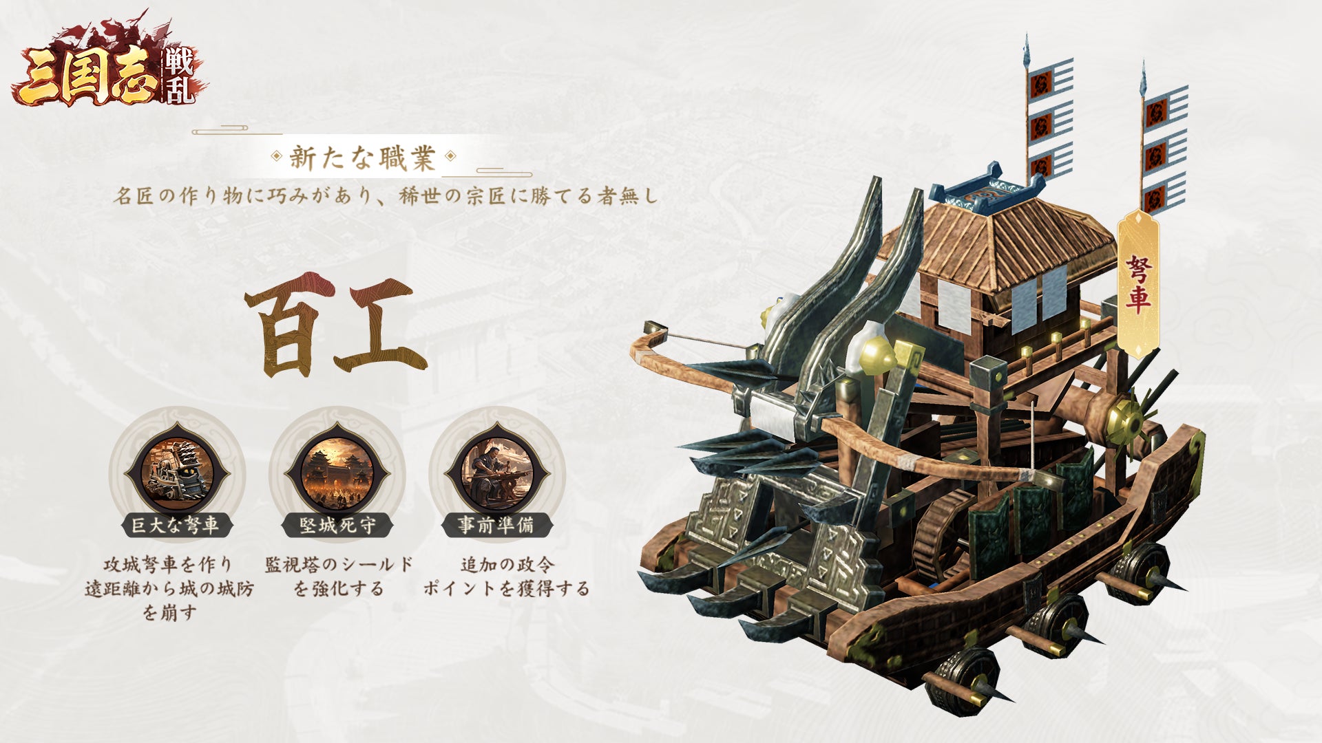 「百工」になる主君様は政令値上限を増加させますし、攻城弩車を建造し対象建築物への遠距離攻撃ができます。また、味方連盟の哨塔に防御シールドを強化できます。