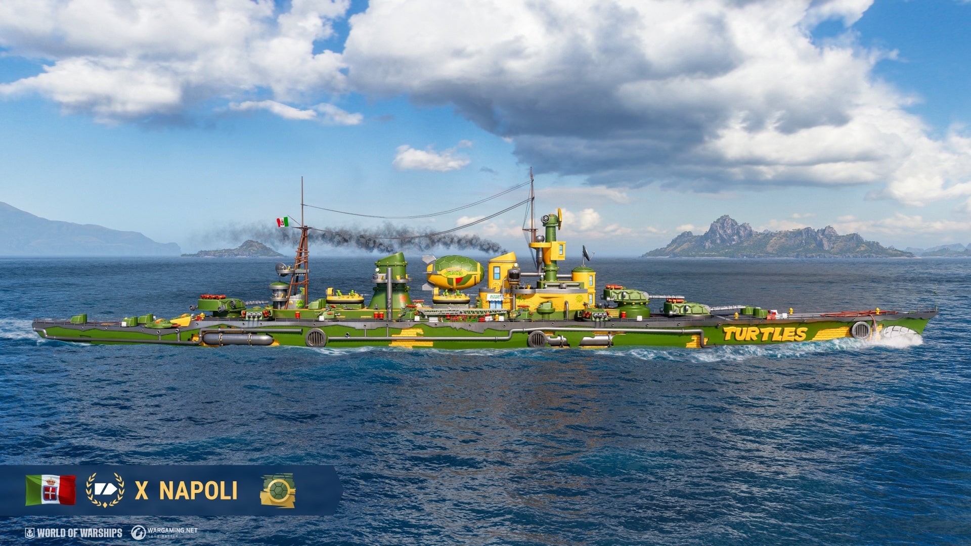 カワバンガ!のセリフでお馴染みの『ミュータント・タートルズ』と『World of Warships』のコラボレーションを記念して、さまざまなコンテンツが9月26日から登場します。イタリアTier X巡洋艦 Napoli用の無期限迷彩「タートルの隠れ家」、ドイツTier X戦艦Schlieffen用の無期限迷彩「フット団」の2種の迷彩が登場し、それぞれバンドルから入手が可能です。上記以外にもタートルズとヴィランをテーマにした2種の迷彩が新たに登場します。