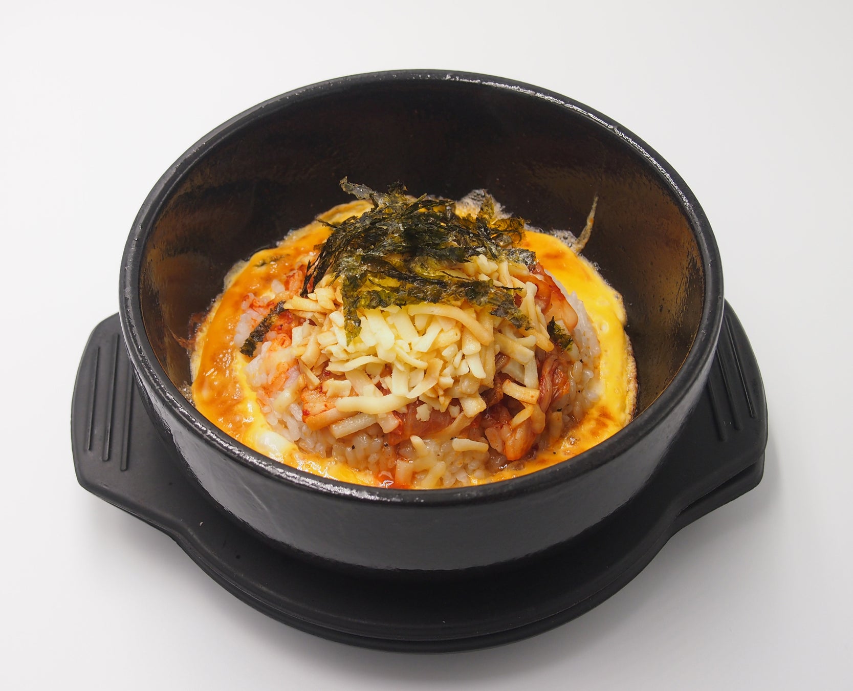 ◆キムチチーズポックンパ(韓国風炒飯):サムギョプサルの〆の炒飯を土鍋で再現。キムチ・チーズ・韓国海苔・玉子をよく混ぜてお召し上がりください