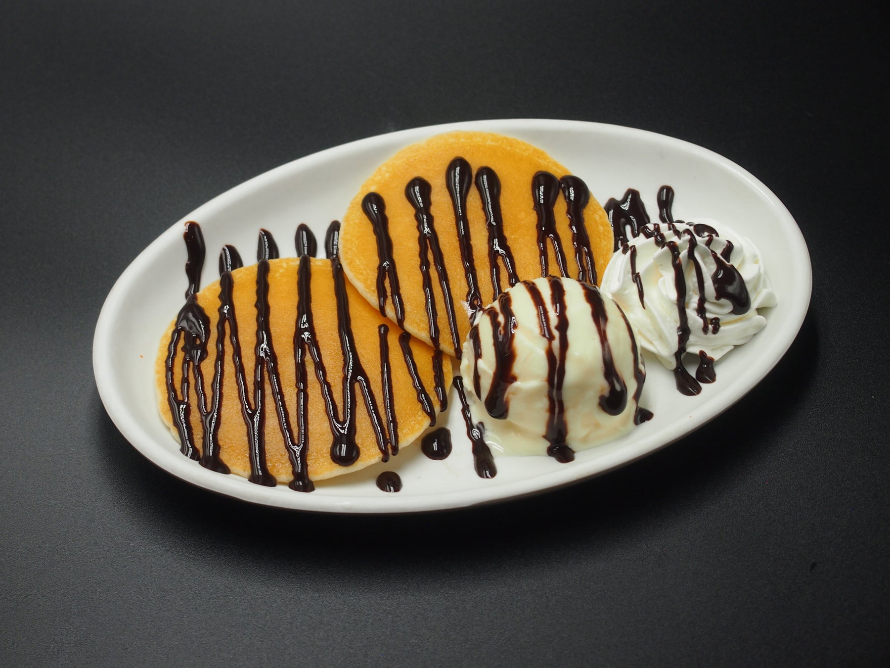 ◆ショコラソースパンケーキ:あったかパンケーキにとろけるアイスをショコラソースで