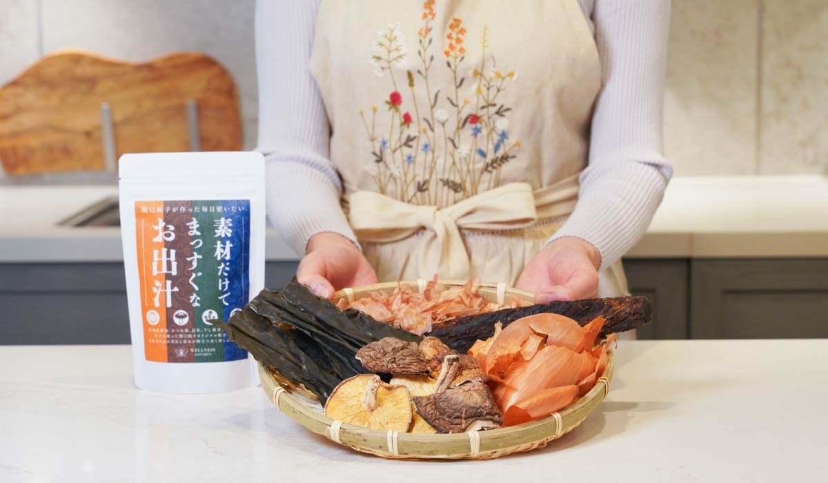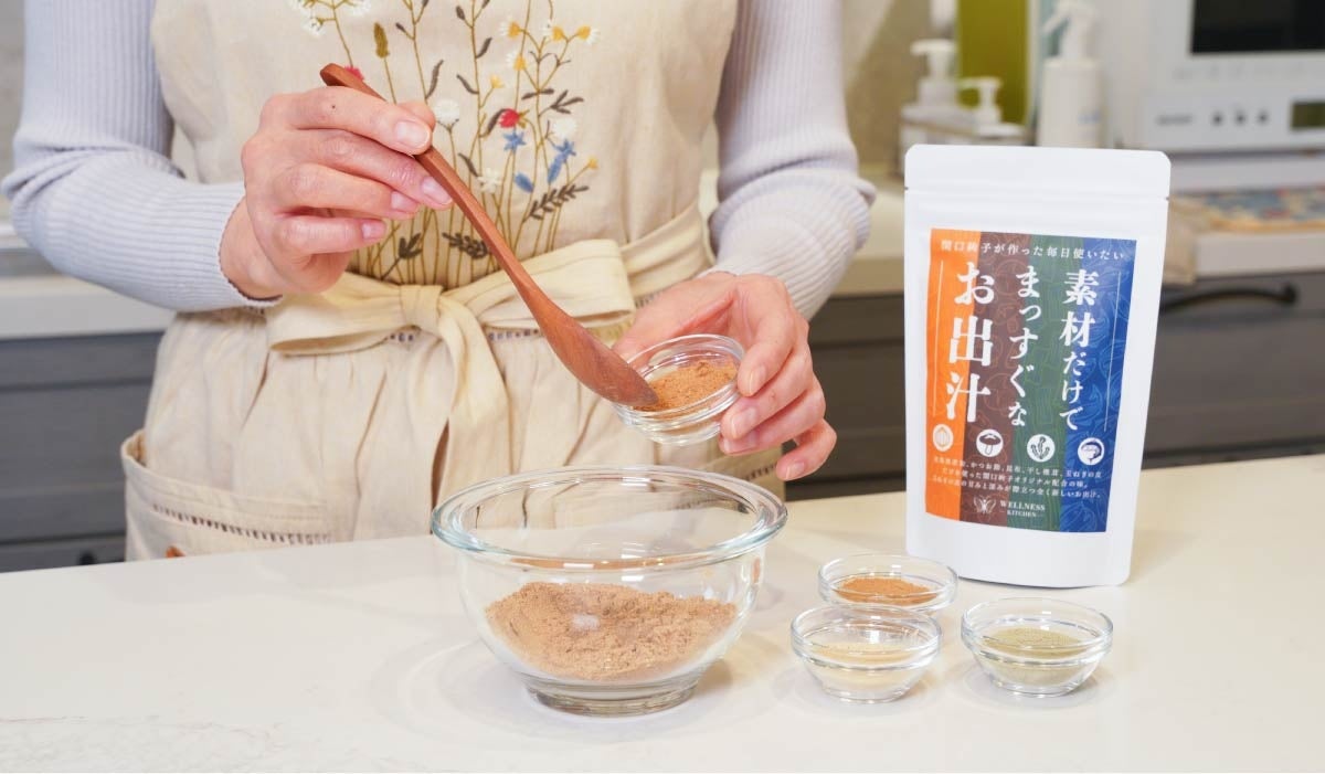 51歳の時に始めたYoutubeチャンネルは、わずか3年足らずで登録者40万人を突破した「管理栄養士 関口絢子」。動画1本あげるごとに平均再生回数は10万回を超え、60代以上のシニア世代から絶大な支持を集めています。関口絢子がプロデュースするブランド「ウェルネスキッチン」の第1弾商品「うぇるね酢」は、1ヶ月を待たずに即売り切れに。ファンが待ちわびたオリジナル開発商品第2弾は、食塩や保存料を使用せず、その名の通り素材にとことんこだわった「素材だけでまっすぐなお出汁」。【かつお節・昆布・干し椎茸・玉ねぎの皮】の4つの素材をブレンドした粉末出汁です。それぞれのうま味のかけ合わせと有用成分に着目して素材を厳選。和食だけでなく、幅広い料理に使える味わいです。毎日の食卓に寄り添い、シニア世代の健康をサポートします。