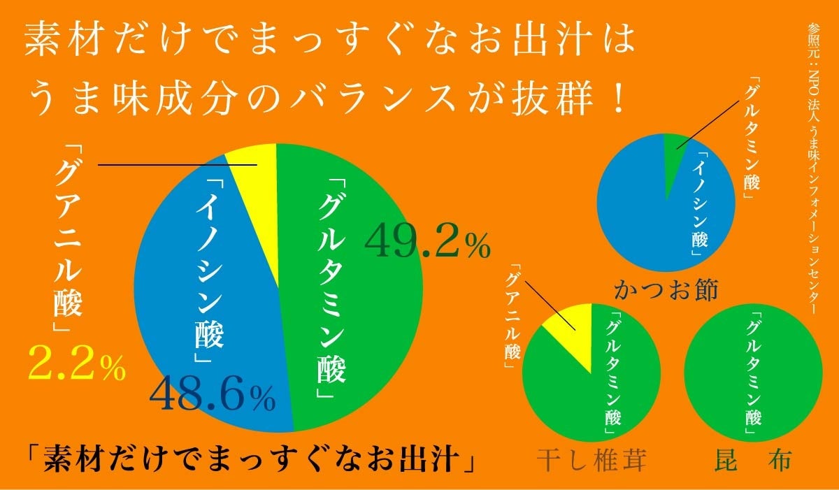 昆布に含まれる「グルタミン酸」、かつお節に含まれる「イノシン酸」、干し椎茸に含まれる「グアニル酸」の3種類のうまみ成分がすべて含まれます。