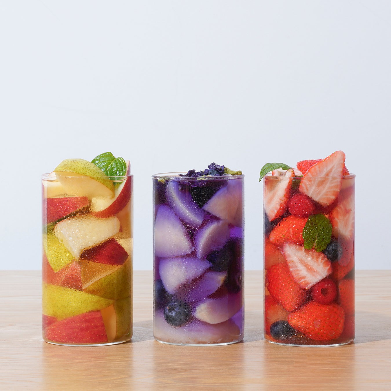 夏のひとときに華やかさを添える、色とりどりの水出しのノンカフェインハーブティー