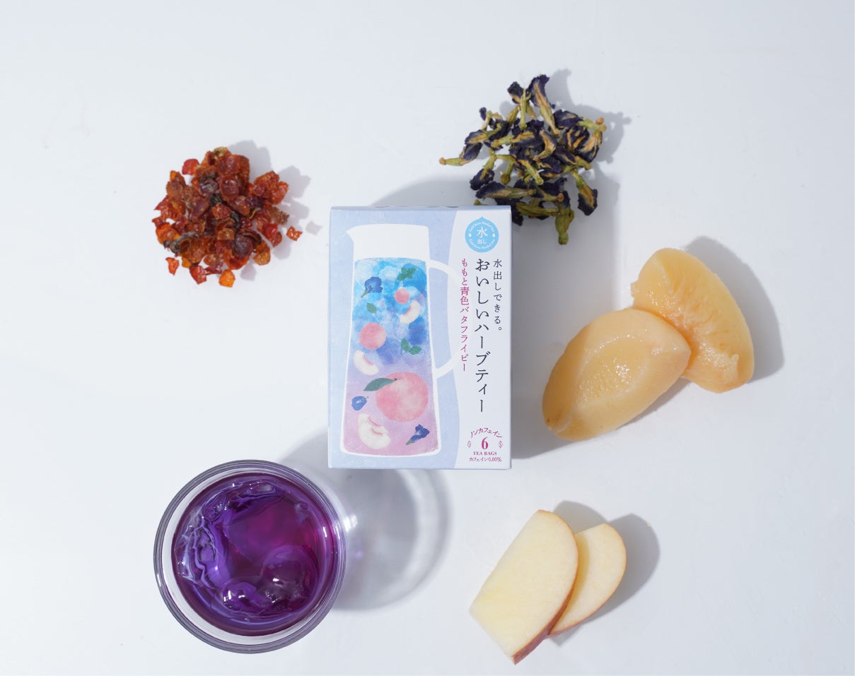 ももが香る青色がきれいなハーブティー。レモンを絞ると、魔法のように、青から紫、さらに鮮やかなピンク色に変わります。