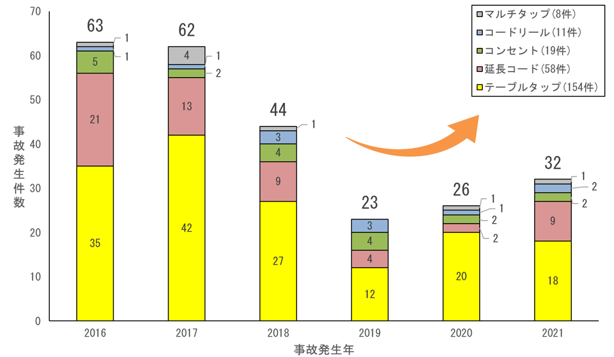 テーブルタップ・延長コードなどの発火事故 減少傾向から一転、2年連続事故増加