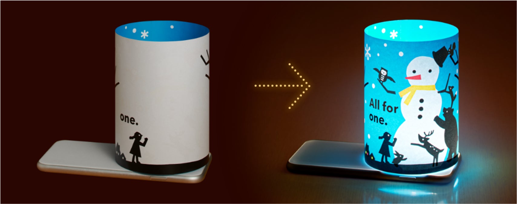 広告のランタンシェード部分を切り取って円筒状に丸め、スマートフォンなどの上に置いてライトをつけると、食卓を明るく照らす「団ランランタン」になります。また、灯りとともに隠れていたイラストが浮かび上がるので、ライトをつける前と後でひと続きの物語が楽しめます。