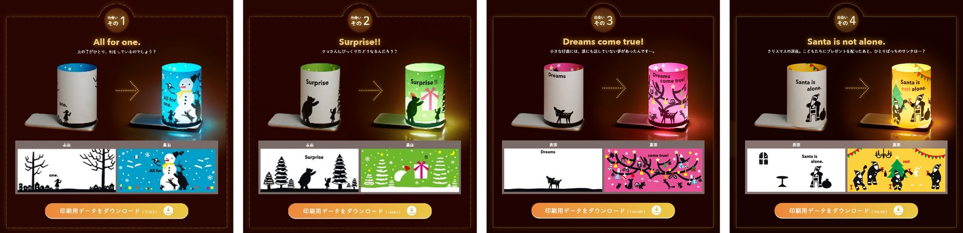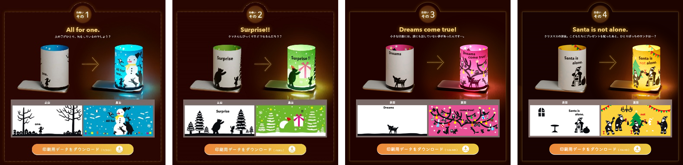 ランタンシェードのデザインは、2018年の「国際女性デー」で世界12人の女性アーティストに選出された、人気切り絵作家のたけうち ちひろさんに制作していただきました。4種類のデザインは、それぞれ「クリスマスの素敵な出会い」をテーマとしており、北海道の動物たちもたくさん登場します。ライトをつける前と後で絵柄が変わることによって物語が展開するので、スマホの上に置いて楽しみたくなる仕掛けとなっています。