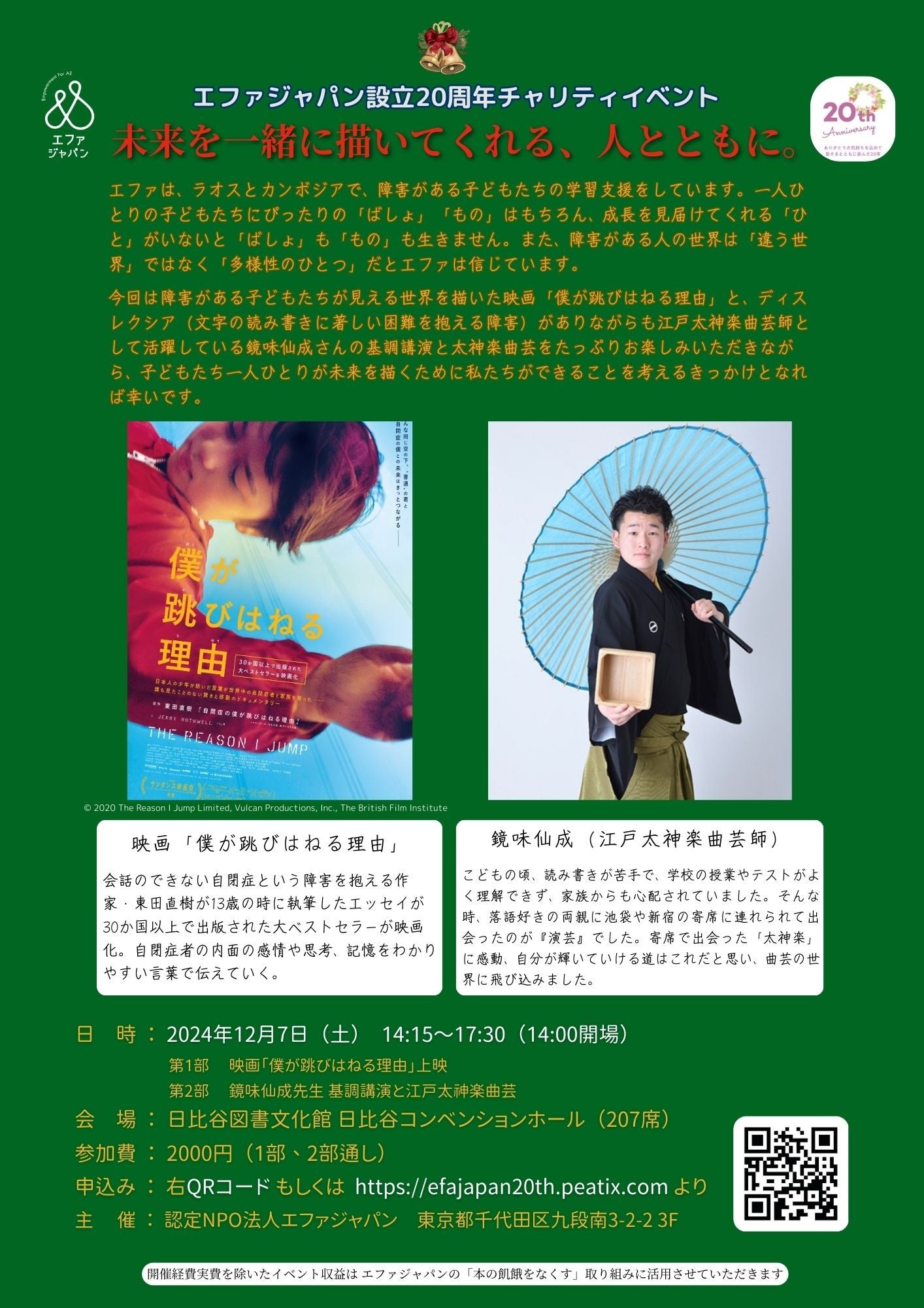 エファジャパンは、12月7日(土)、設立20周年を記念するチャリティイベントを東京の日比谷図書文化館(東京都千代田区日比谷公園1-4)で開催します。自閉症の子どもが主人公の映画上映や、江戸太神楽曲芸師の鏡味仙成さんのトークショーを通して障害のある子どもたちへの理解を深めます。参加費は2000円です。
