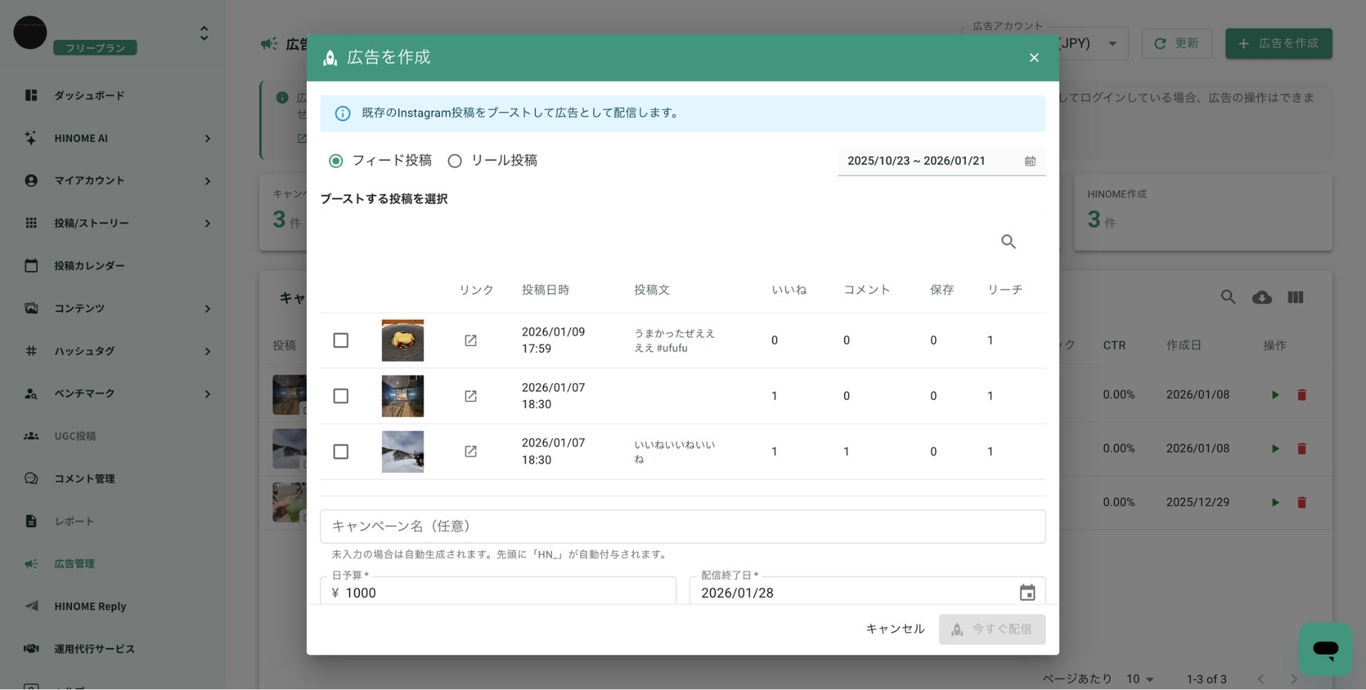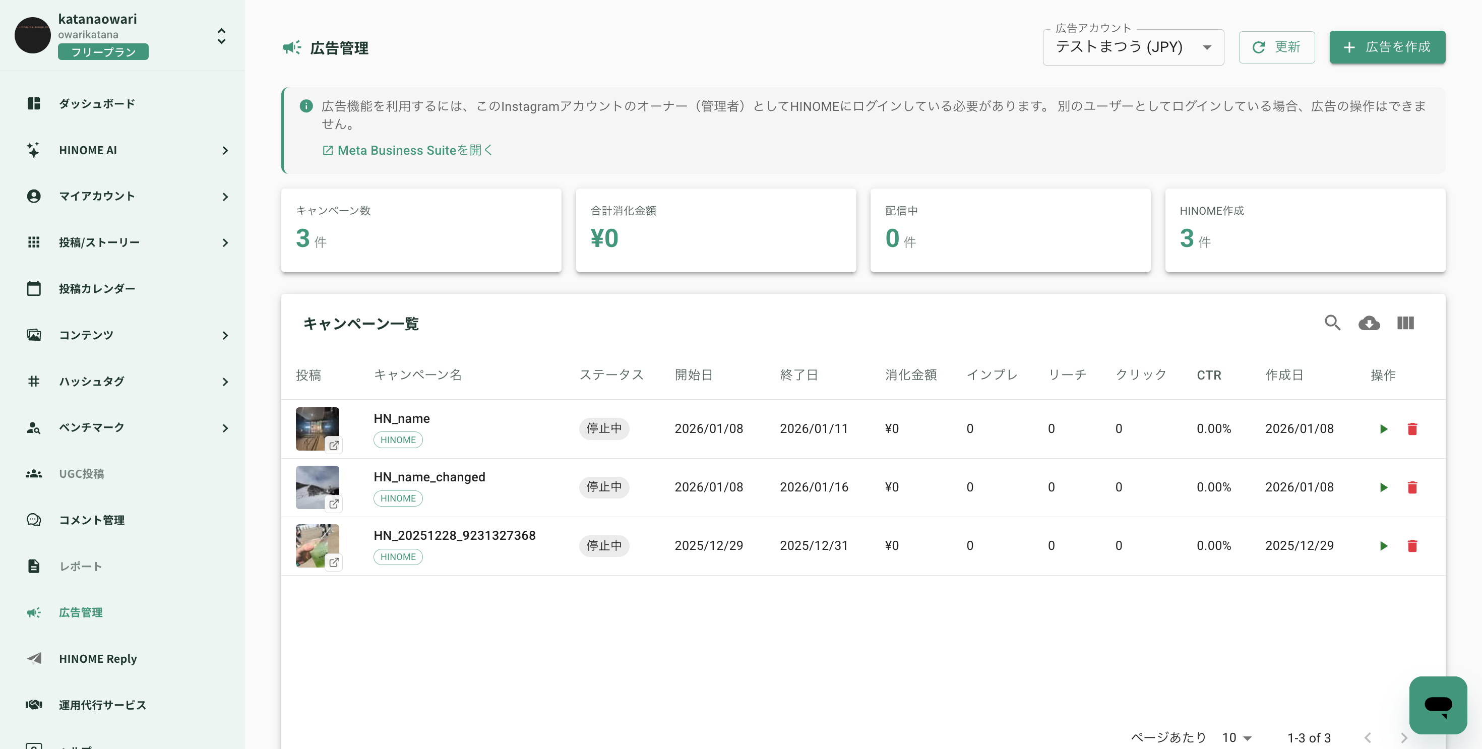 【業界初】Instagram分析ツール「HINOME」、Meta広告出稿機能(β版)を2026年2月より提供開始。オーガニック投稿の分析から広告配信までをワンストップで実現。※自社調べ