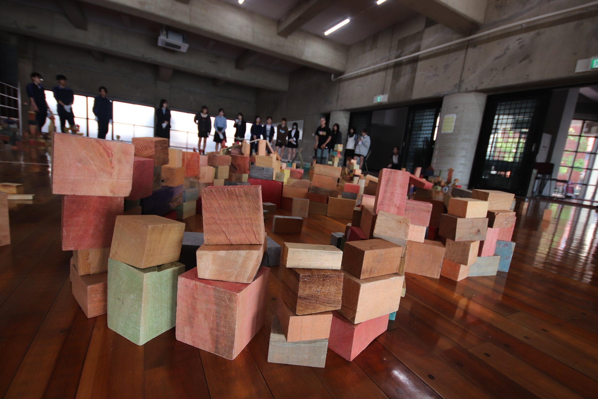 彫刻家・西村拓氏を迎え、色材や立体を用いて空間を構成するワークショップを実施。形や素材が持つ力を実感しながら、生徒たちは「空間そのものをデザインする」という視点を体験しました。