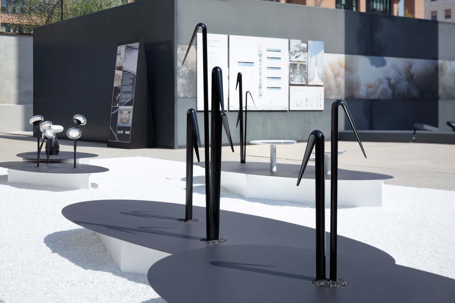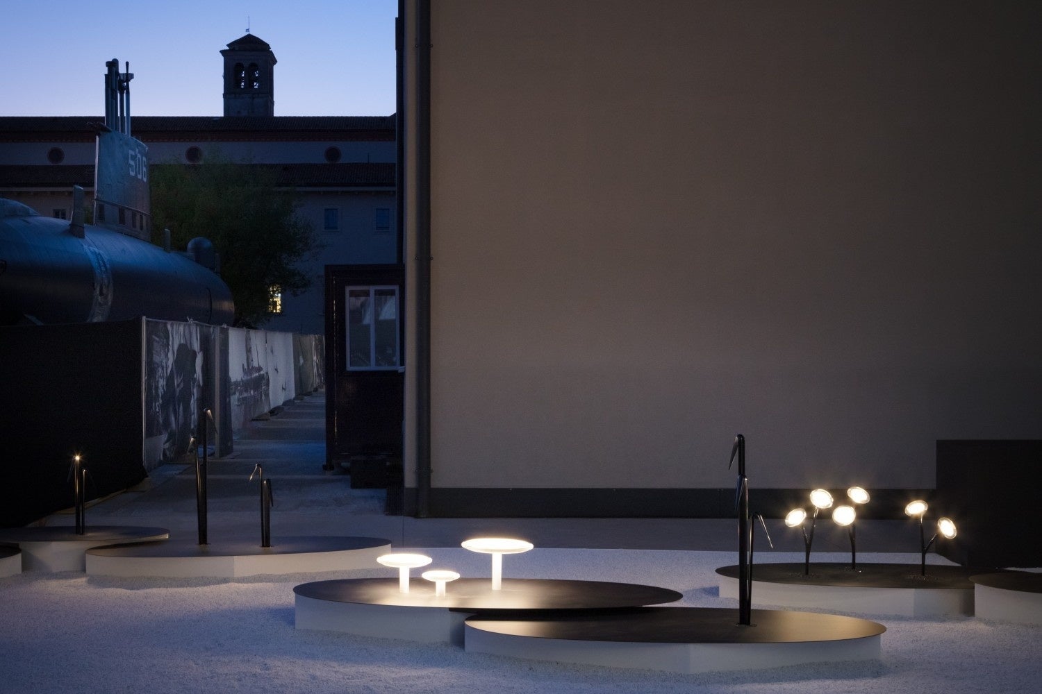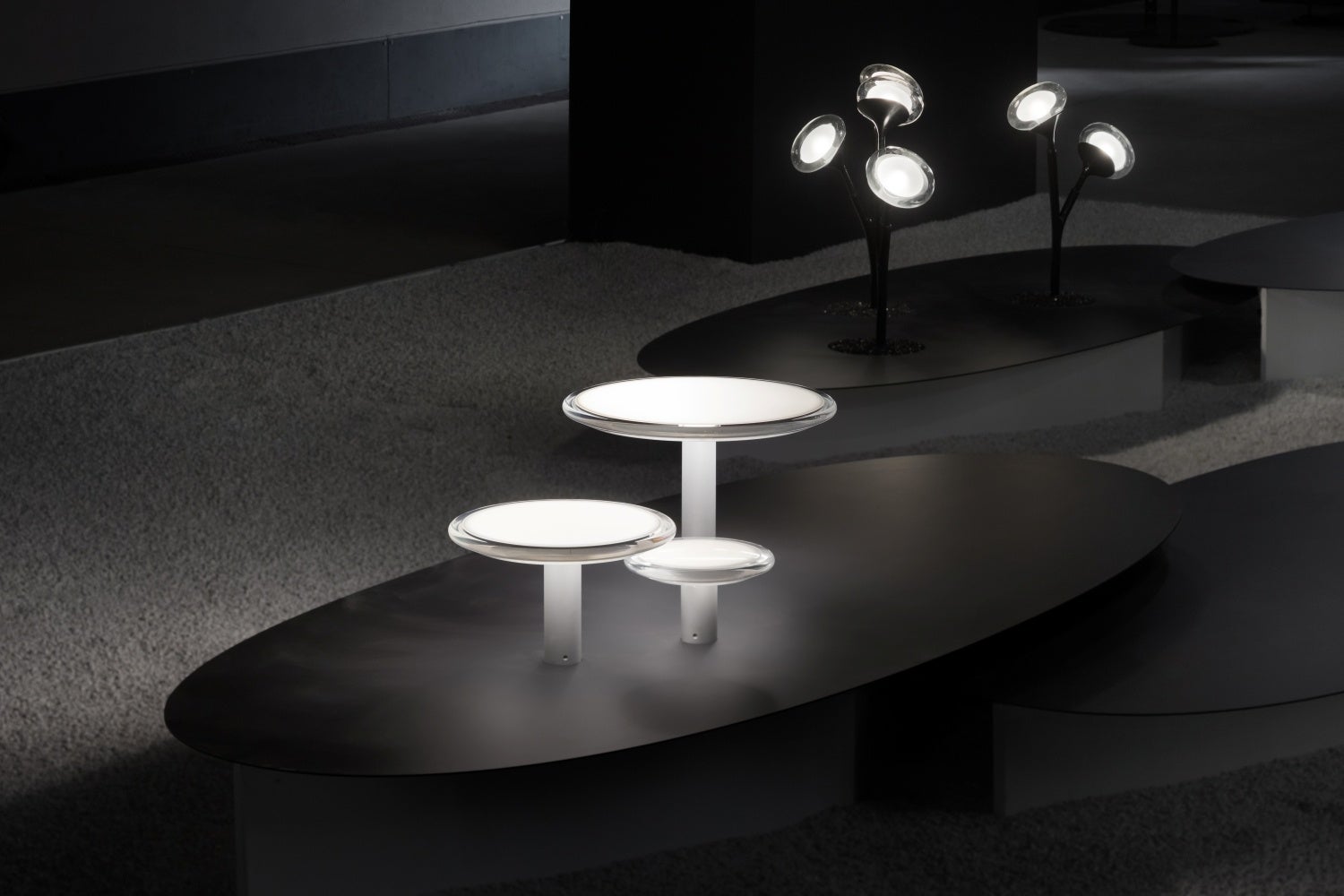 展示会場のレオナルド・ダ・ヴィンチ記念国立科学技術博物館「Cavallerizze(カヴァッレリッツェ)」には、白い砂利の上に黒い楕円状のプレートを点在させ、各製品をランダムに配置することで、人工的ではない自然なリズムを感じさせる空間を作り上げました。白と黒のモノトーンに絞ったシンプルな展示デザインにより、『yomosugara』の有機的なフォルムや安らいだ灯り、日本的な精神性を印象づけることに成功しました。
