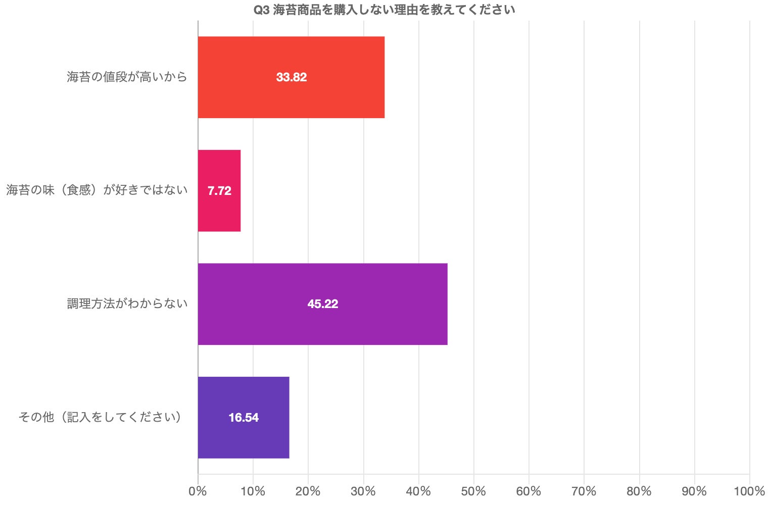 また、海苔商品を購入しない理由も調査すると、「調理方法がわからない」との回答が最も多かったです。