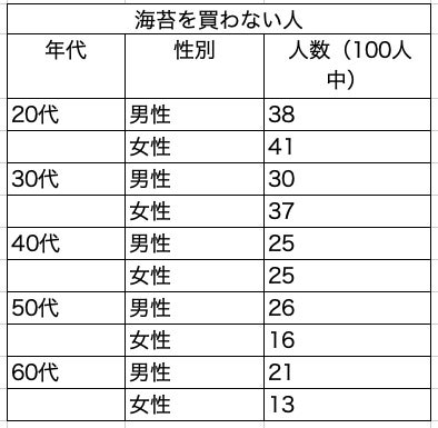 結果、20代、30代で約4割の人が購入しないと回答し、40代以降に海苔の需要が高くなっていることがわかりました。