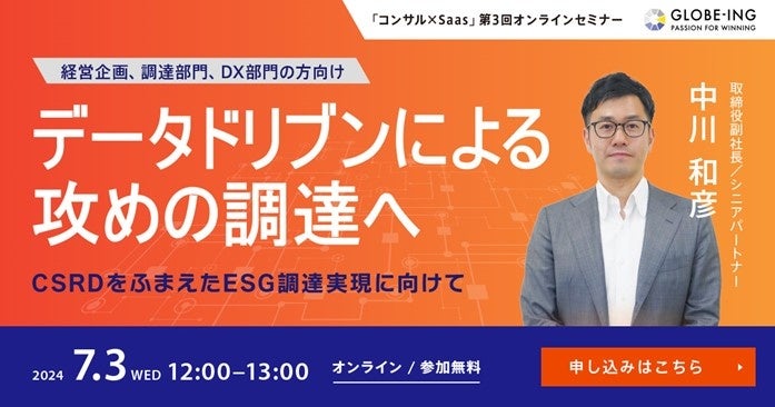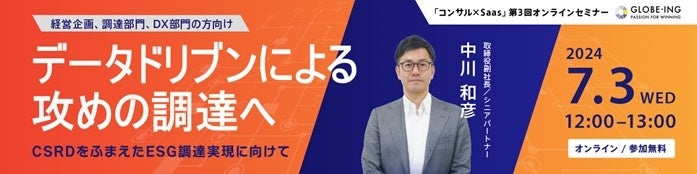 7/3(水)12:00【オンラインセミナー】「20240703_「データドリブンによる攻めの調達へ」セミナープレスリリース」~CSRDをふまえたESG調達実現に向けて~