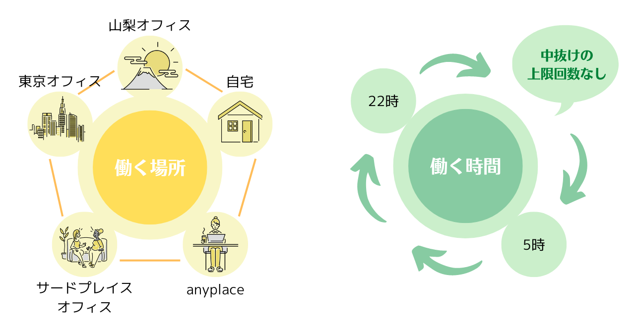 テレワークで働く場所の選択肢を増やしつつ、働く時間の選択肢を増やすための取り組みをしています。2つの取り組みを合わせて「働き方選択制度」と名付けています。働く時間に関しては「朝5時〜夜10時まで所定労働時間分働く。中抜けは何度でも、1分単位から取得できて事前申請がいらない」という仕組みにしました。働き方選択制度は、担当業務・ポジション・契約区分・入社年数等の制限が一切ないため、全社員が利用することができます。