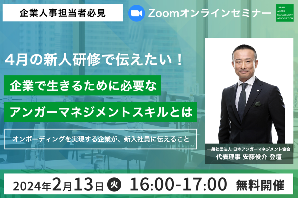 【企業人事担当者必見】2月13日(火)、当会代表理事・安藤俊介登壇オンラインセミナー「4月の新人研修で伝えたい!企業で生きるために必要なアンガーマネジメントスキルとは」開催