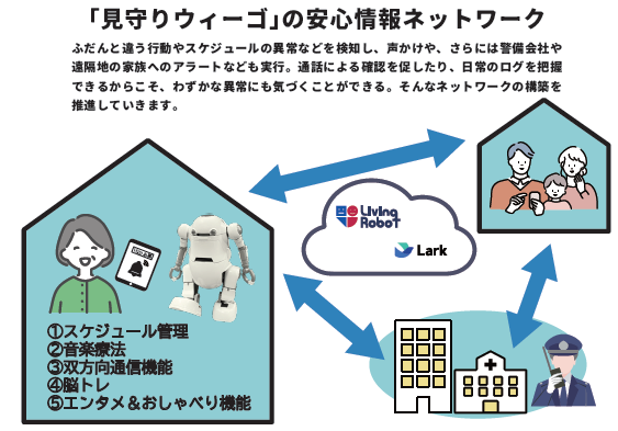展示会では二足歩行ロボット「見守りウィーゴ」は、【①スケジュール管理 ②音楽療法 ③双方向通信機能 ④脳トレ機能 ⑤エンタメ機能・おしゃべり機能】といった、高齢者の日常をより楽しくアクティブに過ごせる5つの機能があり、安心情報ネットワークを構築するプラットフォームです。