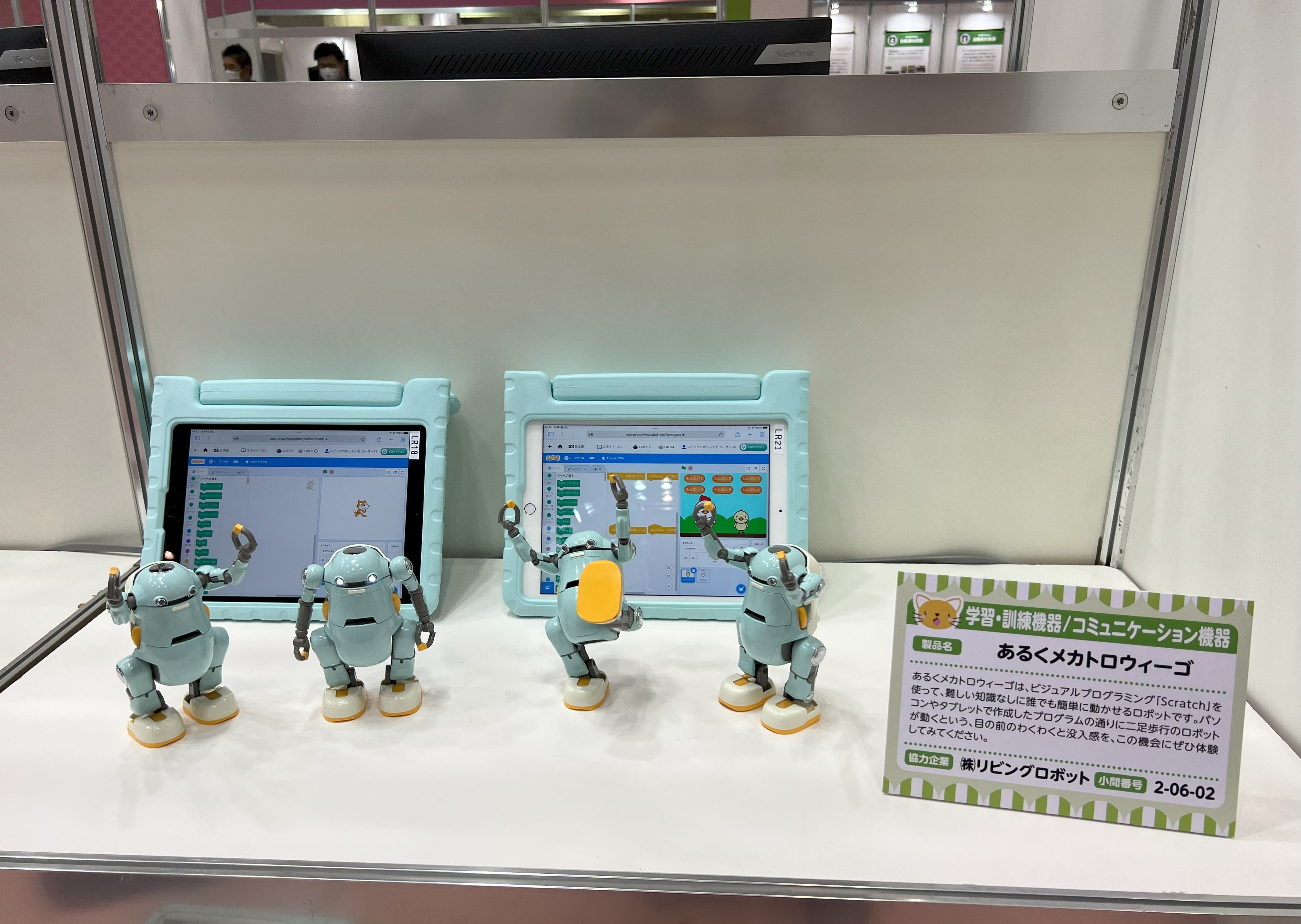 また、こども広場の福祉機器展示ブースにも「あるくメカトロウィーゴ」を展示いたします。全国の小中学校・高校のプログラミングの授業の導入実績がある「あるくメカトロウィーゴ」は、初心者でも基礎からプログラミングを学ぶ事ができ、ロボットの操作も可能となっています。聾学校でのプログラミング体験教室の実施実績もあるウィーゴは、様々な方にプログラミング学習をお楽しみ頂けます。(下の画像は去年の展示の模様です)