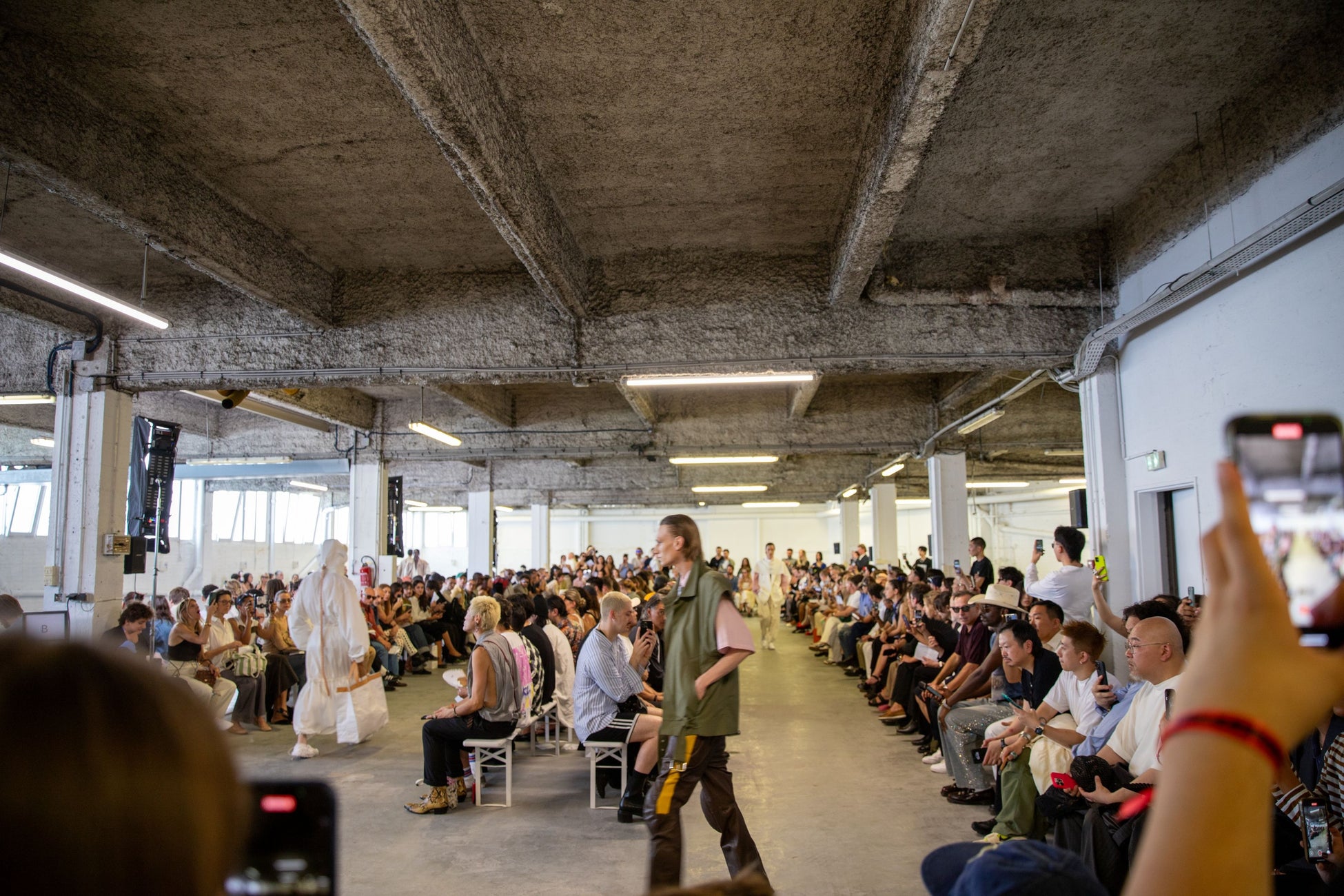 会場は世界中から集まったメディア関係者、バイヤー、セレブリティなどで満席になり注目の度合いが分かります。デイリーにも活躍しそうなネイビーのジャケットや、フェミニンな雰囲気のチュールアウター、会場でも話題になったマント付きのジレなど、トレンド感がありながらも取り入れやすいカラーや生地のコレクションに観客も満足そうな様子。