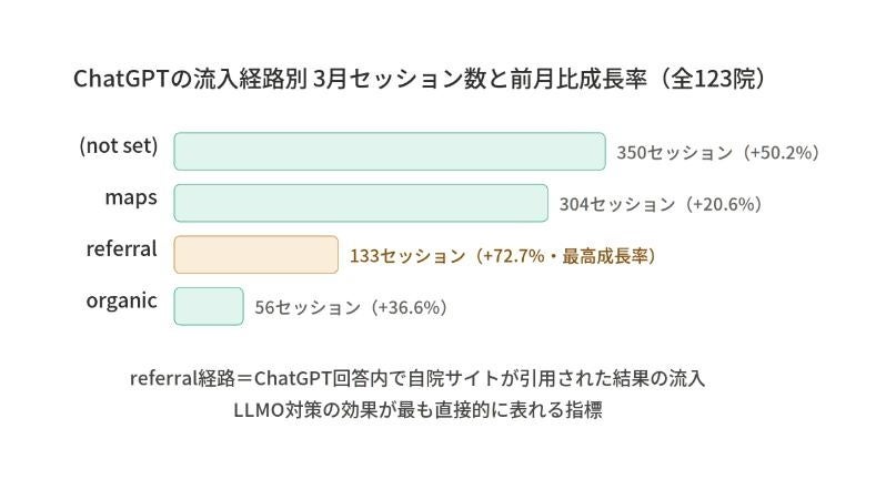 また、referral経路(AI回答内でクリニックのWebサイトが引用・参照された結果の流入)は前月比+72.7%と最高成長率を記録しており、AIへの引用最適化(LLMO対策)の効果が最も直接的に表れる指標と位置付けられます。