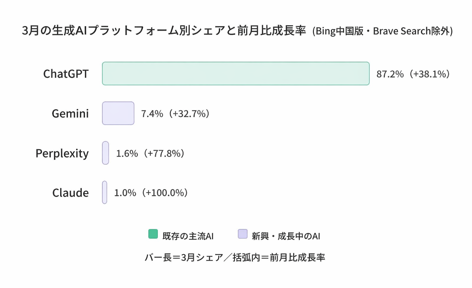 ChatGPTが約87%のシェアを占有、Gemini・Perplexity・Claude等の新興AIは成長率でChatGPTを上回る